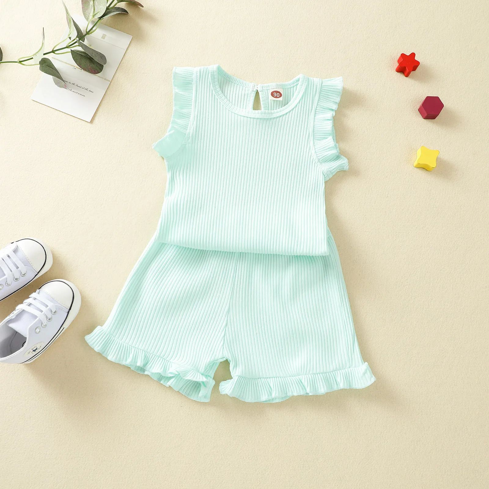 Комплект одежды для девочек из 2 предметов, летний топ без рукавов с оборками и шорты, одежда для маленьких девочек
