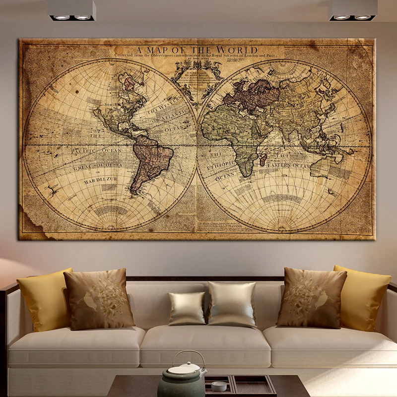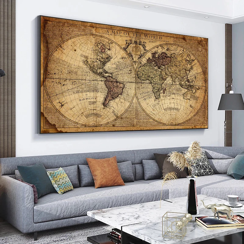 Винтажная карта мира, холщовая живопись, настенный художественный плакат и принты, старинная карта, старинная ретро-карта, картина для гостиной, домашний декор, Таблица
