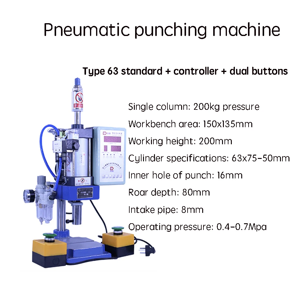 Максимальное давление: 200 кгРабочее давление: 0,4-0,7 МПа (4-7 кг/см2, 110-140 psi)Входное напряжение: 110 В/200 вСпецификация цилиндра: 63*75-50 ммРазмер рабочего стола: 150*135 ммРабочая высота: 200 ммДырокол внутреннее отверстие: 1616 ммИмпортные воздушные трубы Характеристики: 8*5 ммРазмеры посылка: 26,4 "x 13,4" x 13,4 "(67x34x34 см)Вес упаковки: 21 кг