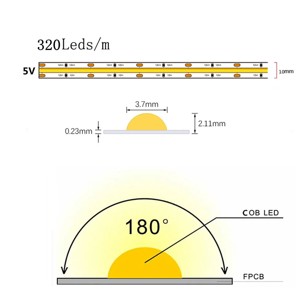 Название продукта: 5 В COB светодиодный светильникСветодиодный чип: COB светодиодныйКоличество светодиодов: 320 светодиодов/мВходное напряжение: 5 В постоянного токаРабочее напряжение: 5 В постоянного токаМощность: 7-10 Вт/мИндекс цветопередачи: CRI >90RaДлина: 1-5 метровСветильник Цвет: теплый белый (3000-3500K), натуральный белый (4000-4500 к), белый (6000-6500K)Ширина печатной платы: 10 ммУгол обзора: 180 °Водонепроницаемость: IP33Рабочая температура: -20 ℃-+ 45 ℃Температура хранения: -20 ℃-+ 60 ℃Посылка включает в себя: