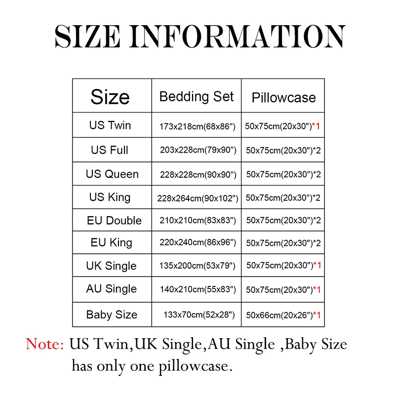 1. Пожалуйста, выберите размер постельного белья в соответствии с вашим размером одеяла.2. Размер пододеяльника должен быть одинаковым с вашим одеялом, например, если ваше одеяло 200x230 см, поэтому вы должны выбрать пододеяльник 200x230 см,Поэтому вы должны выбрать подходящий размер королевы или другие соответствующие размеры.3. Размеры в разных странах отличаются, поэтому мы указываем размеры в сантиметрах или дюймах.