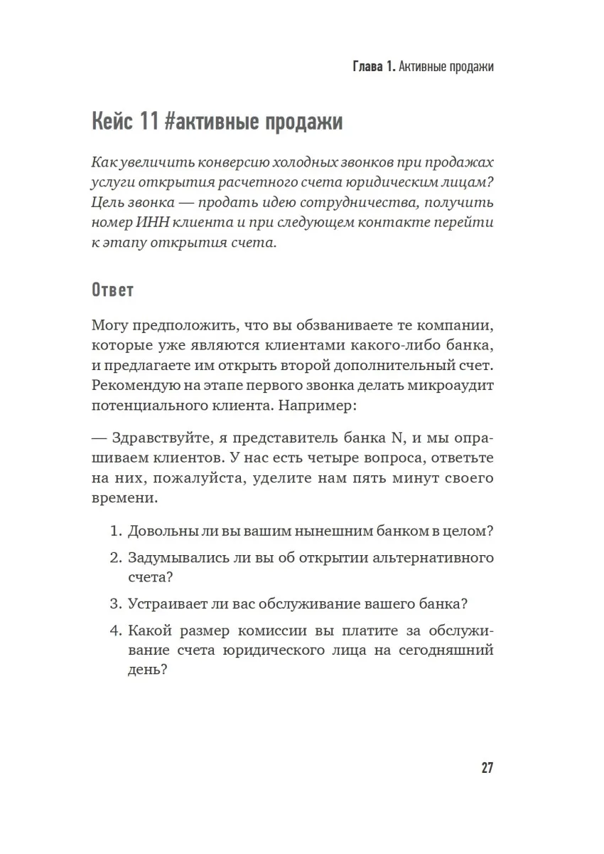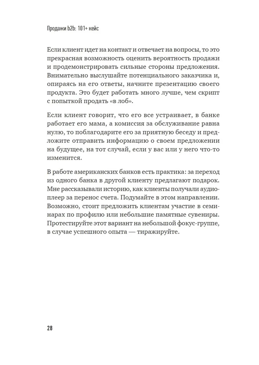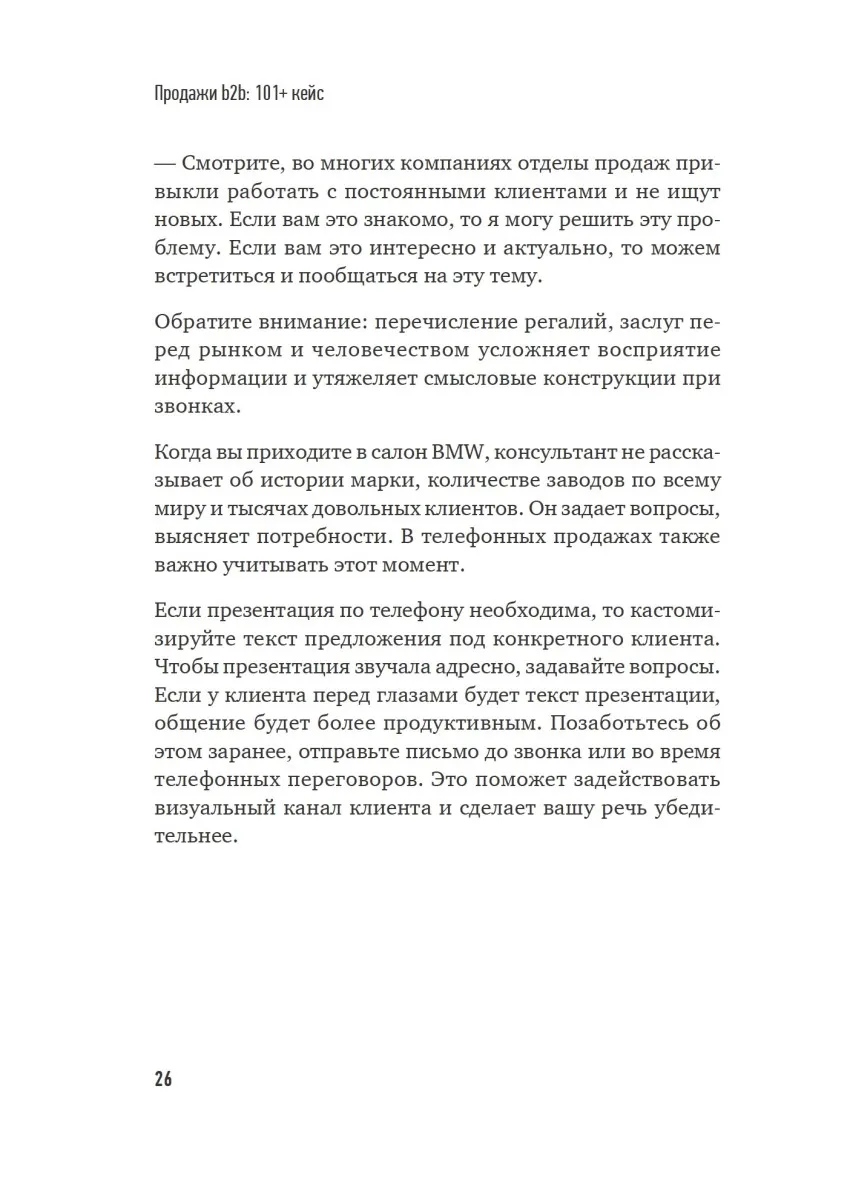 Книга, которую вы держите в руках — квинтэссенция моего опыта, как продавца, переговорщика и тренера по крупным и экспертным продажам в секторе B2B. Для простоты восприятия и удобства навигации для читателей материалы собраны в формате «вопрос-ответ».В книге нет ни одного выдуманного кейса, все вопросы в разное время были присланы мне менеджерами по продажам и собственниками компаний из различных отраслей бизнеса. Благодаря этому соавторству книга получилась живой, актуальной и адаптированной к реалиям российского бизнеса. Все советы практичны и легко применимы на практике в В2B продажах.Уверен, что среди этих вопросов — вы найдете свои ответы, те фишки и приемы, которые помогут продавать больше уже завтра! Книга, в отличии от множества пособий, представленных на рынке, не является компиляцией из различных источников и переводом западных авторов. Она — уникальна! И я с гордостью могу сказать, что у Вас в руках «Библия B2B продаж»!