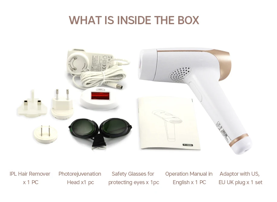 IPL средство для удаления волос с ЖК-дисплеем * 1 шт.Дополнительная лампа для удаления волос в соответствии с выбранным вамиФотолампа (стеклянный тип) * 1 штЗащитные очки для защиты глаз * 1 шт.Адаптер с вилкой US, EU UK * 1 комплектРуководство по эксплуатации на английском языке * 1 шт.
