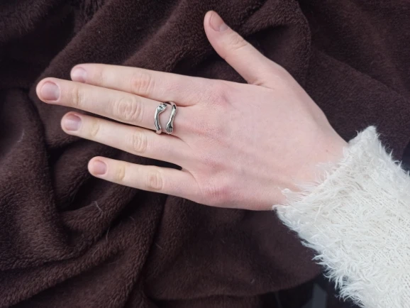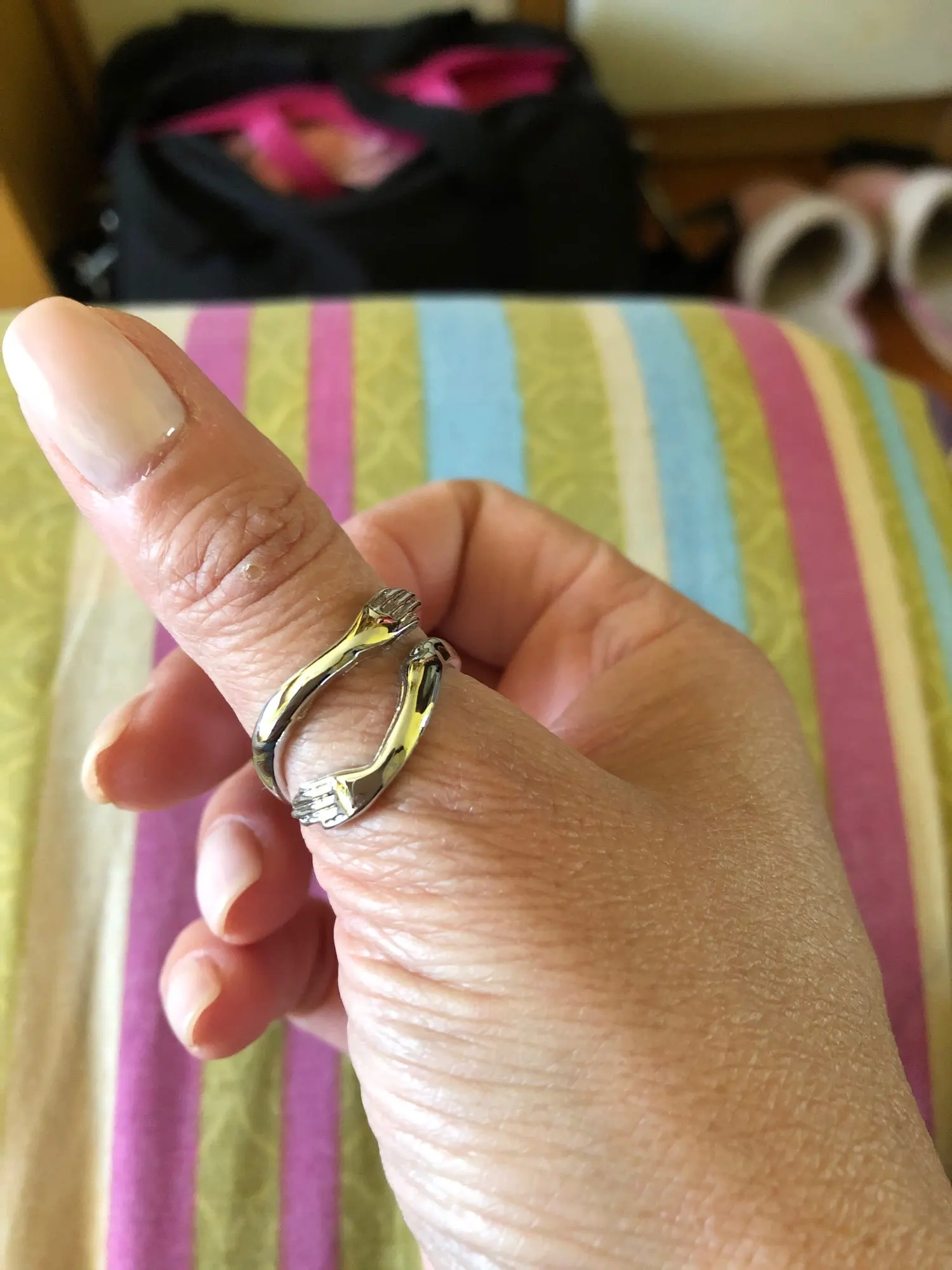 Кольцо очень большого размера. Можно сдвинуть, тогда ладошки не видно. Сами ладошки не очень интересные, на фото лучше. Спасибо! Продавца рекомендую.