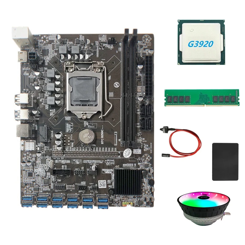 Материнская плата B250C для майнинга BTC + процессор G3920 + вентилятор RGB + DDR4 4 Гб 2666 МГц ОЗУ + SSD 128 ГБ + кабель переключения 12XPCIE в ГПУ слот для карты USB3.0