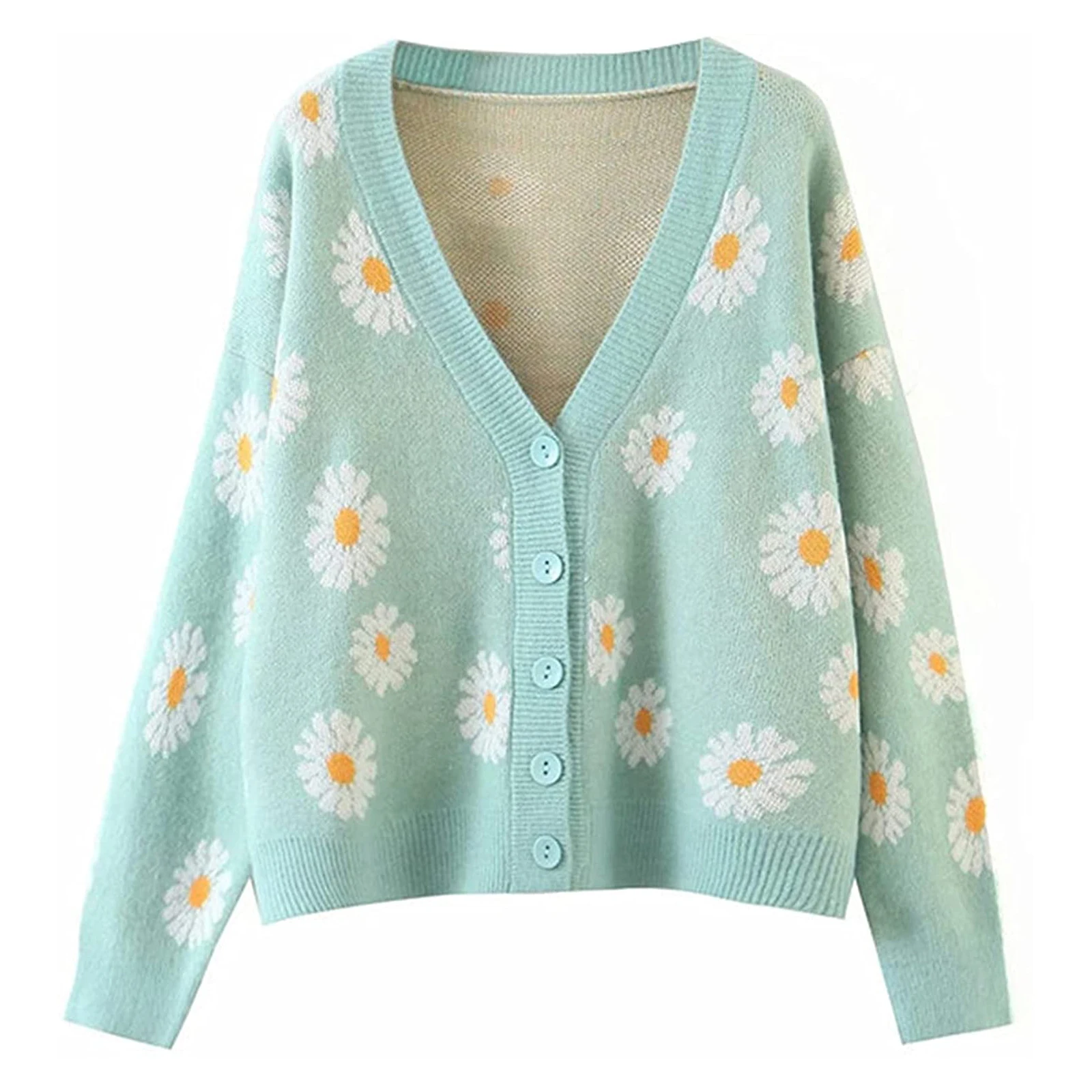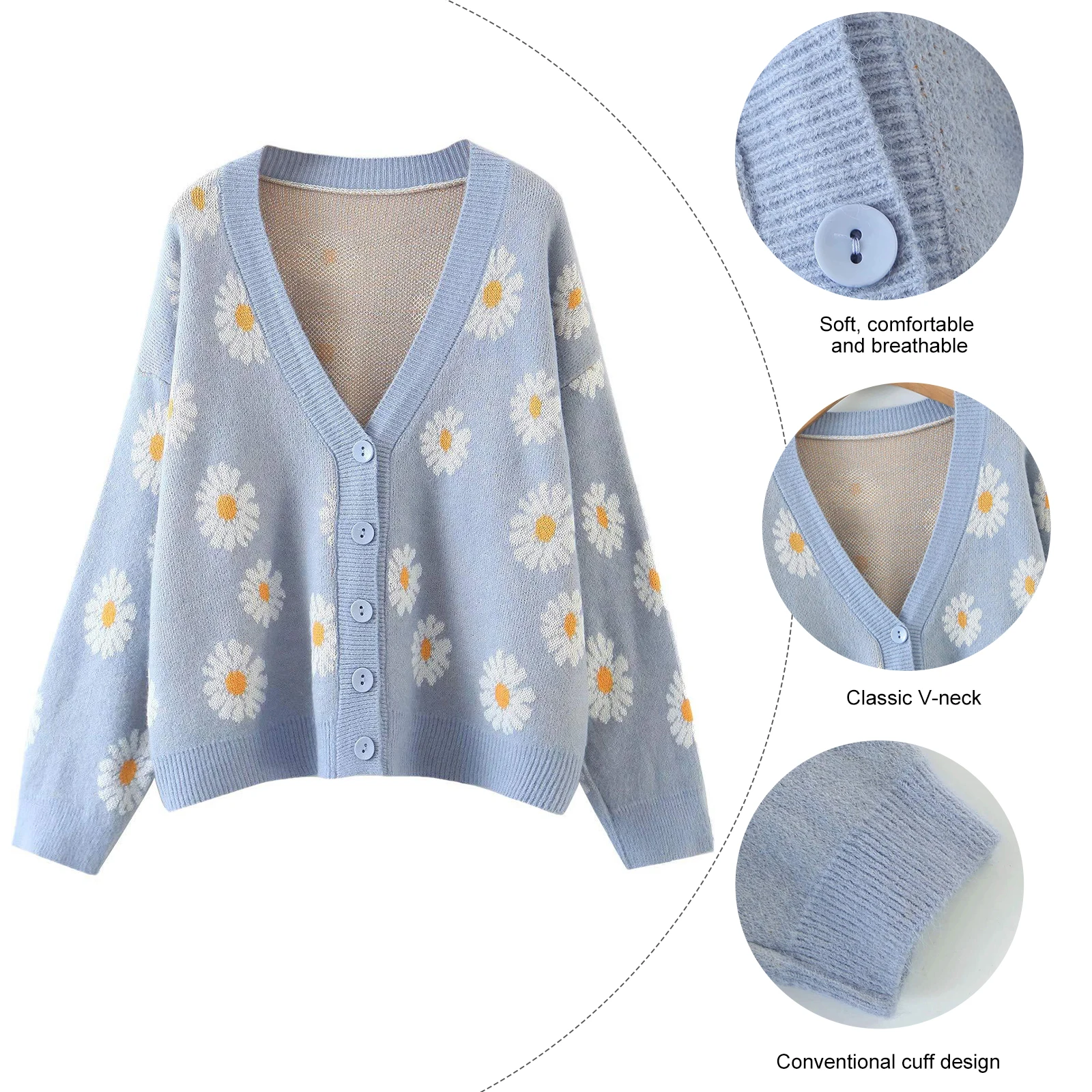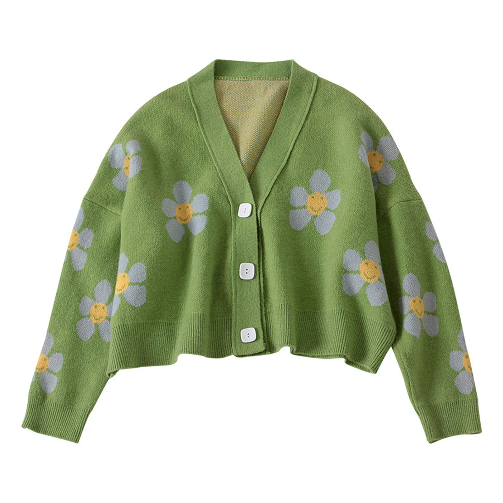 Отличный дизайн: Женский вязаный свитер с цветочным принтом и v-образным вырезом, с длинными рукавами и пуговицами спереди, повседневный Свободный вязаный кардиган, милый кардиган 90s.