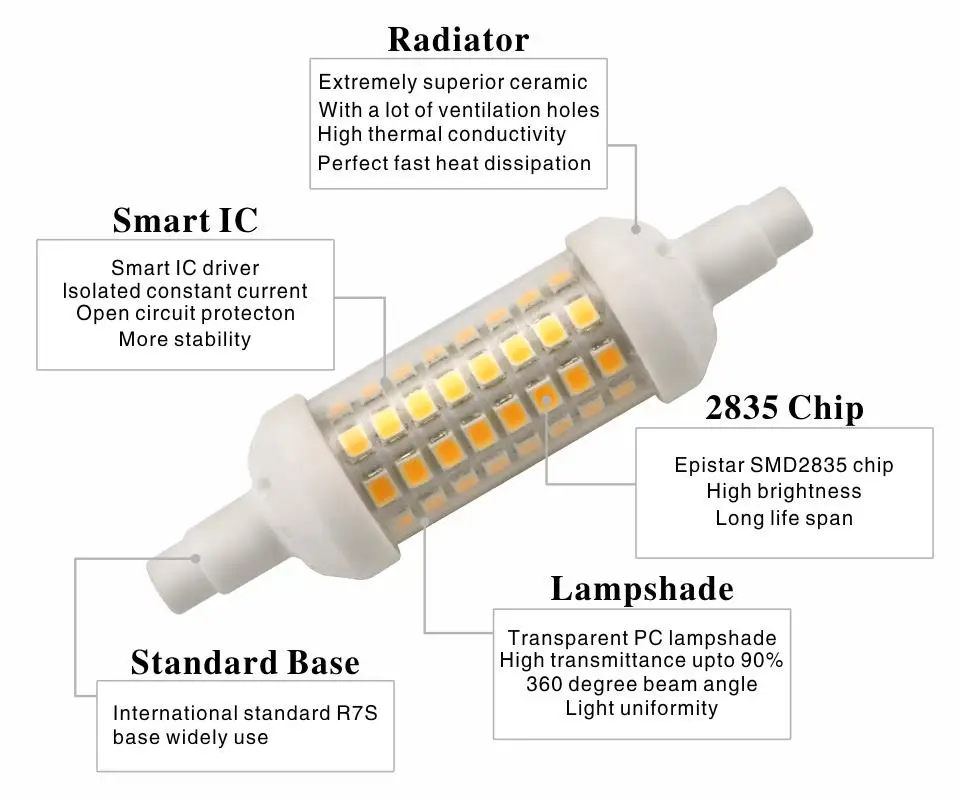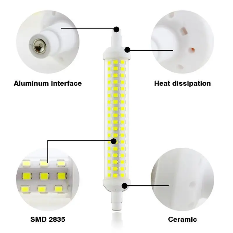 Название продукта: R7S smd 2835 керамический светодиодный светильникВыходная мощность: 10 Вт 15 Вт 20 ВтТип цоколя: СВЕТОДИОДНЫЙ R7SДлина лампы: 78 мм 118 мм 135 ммСветодиодный чип: smd 2835Светодиодный: 64 светодиодный s 80 светодиодный s 144 светодиодный sВход напряжение: AC220V -240VУгол луча: 360 градусовМатериал корпуса: Керамика + акрилТемпература тела: <80Светодиодный температурный режим работы: -40 C ~ + 55 C(Чип на плате) Срок службы: 50000 часовСертификация: CE & RoHSЦвет излучения: теплый белый/холодный белыйЦветовая температура: 2500-3200K (теплый белый) 6000-6500K (холодный белый)