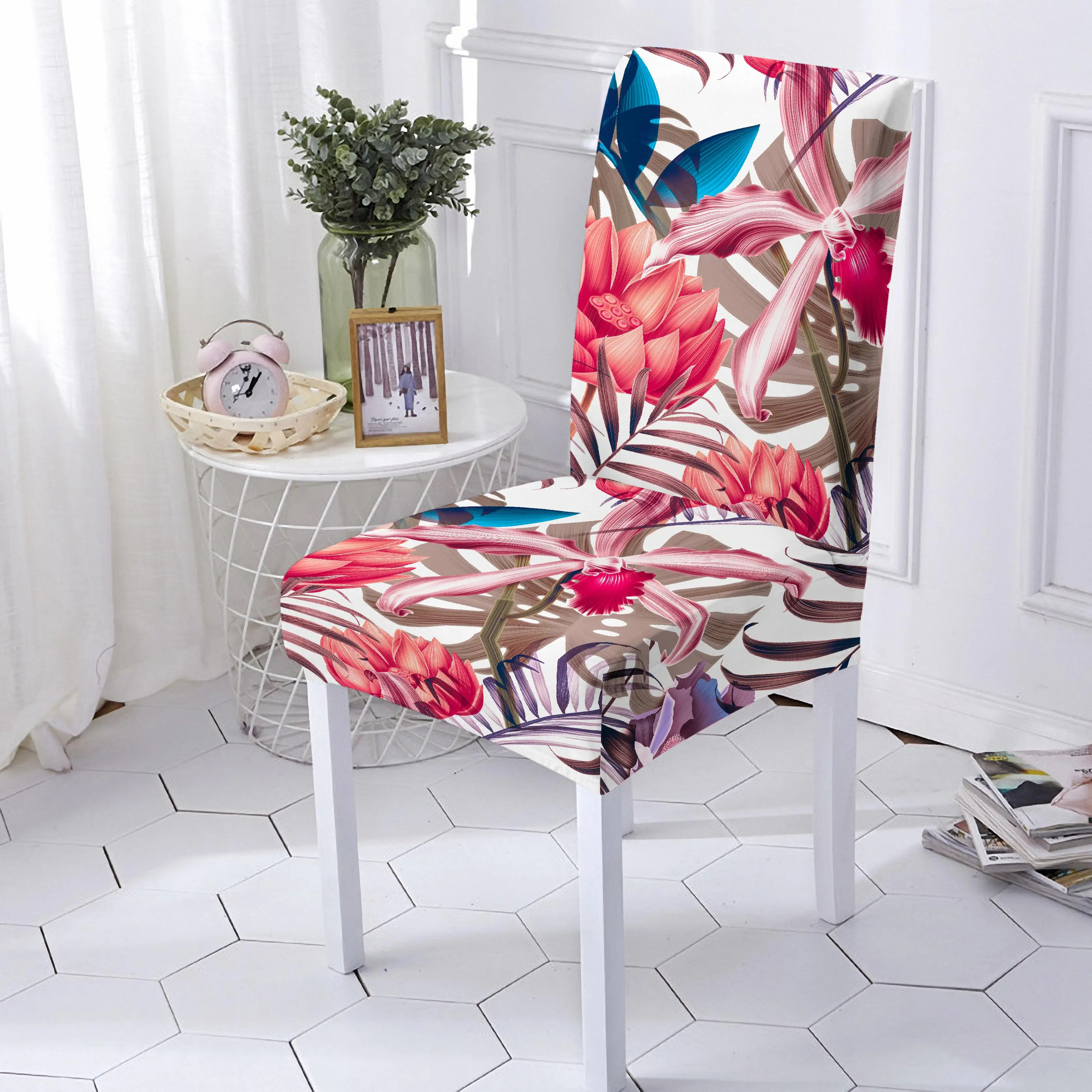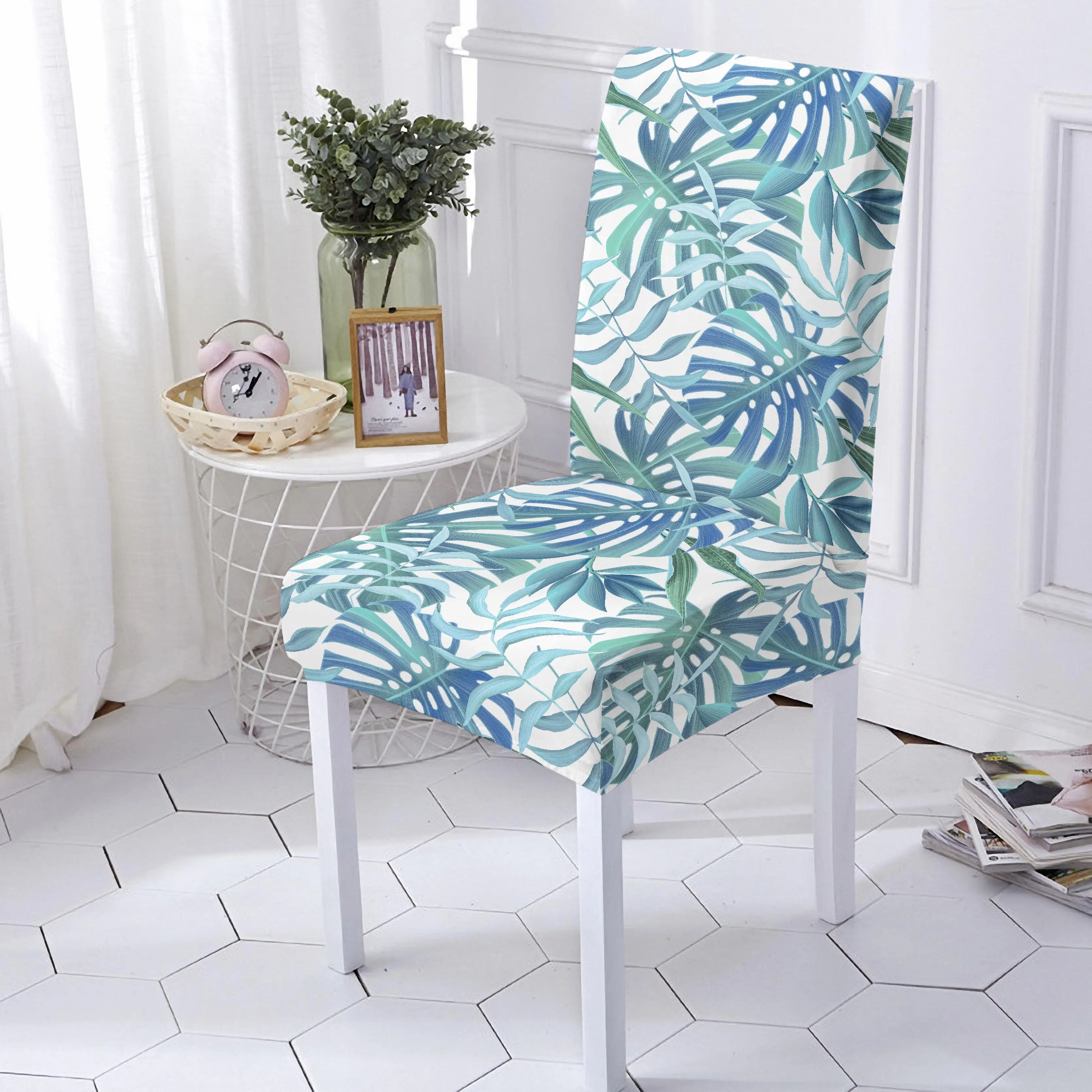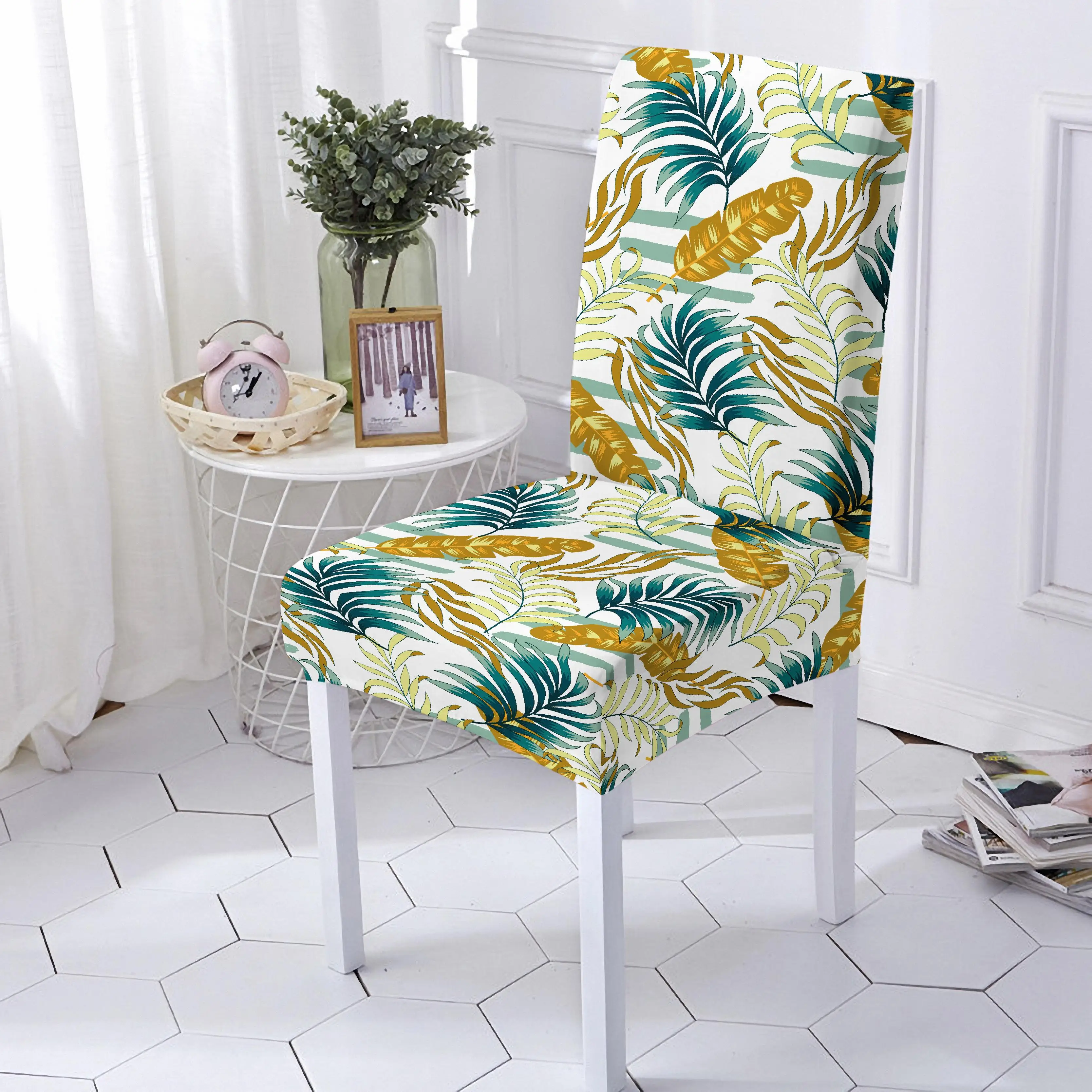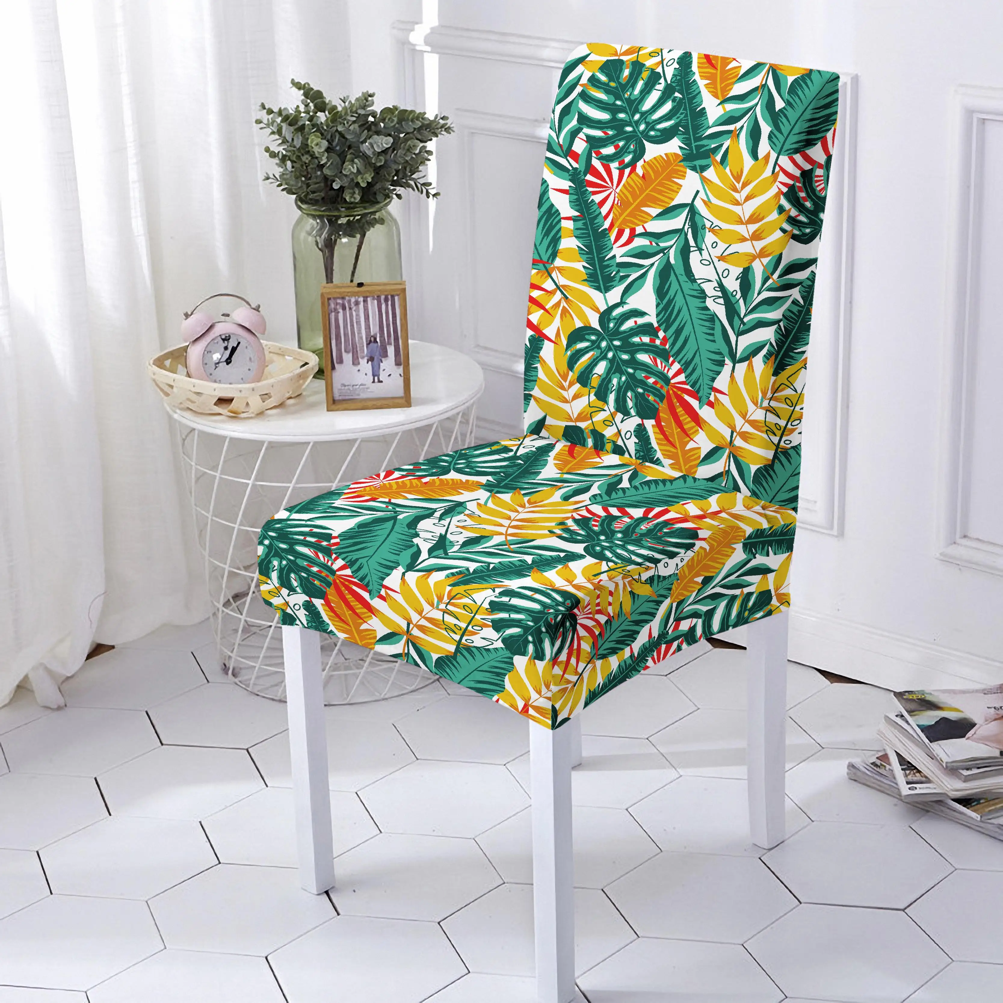 Эластичный чехол на стул, эластичный чехол из спандекса с тропическими листьями и цветочным принтом, съемный чехол для офиса с защитой от грязи