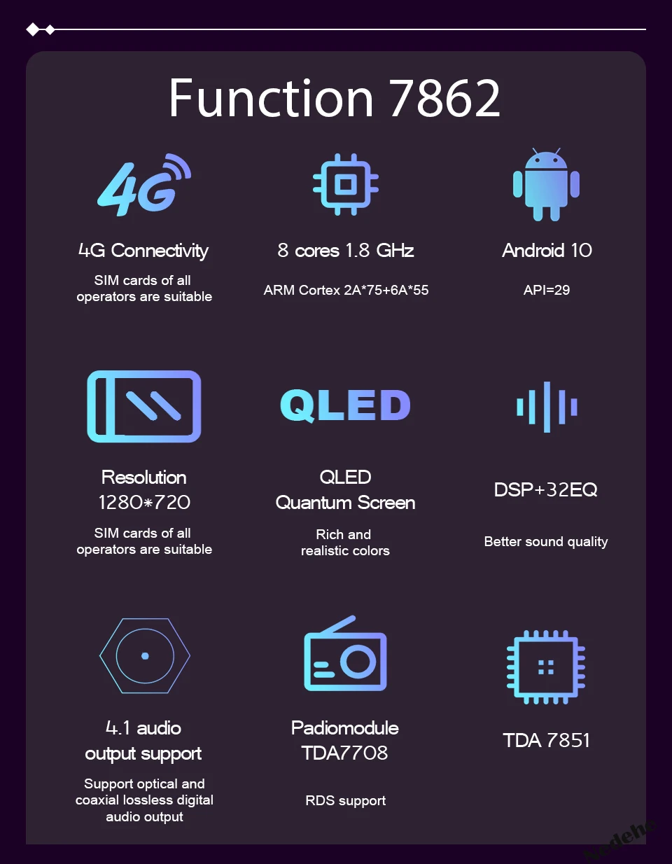 Разъем для sim-карты с 4G антенной (только 7862 версия поддерживает функцию 4G)Поддержка Wi-Fi и Wi-Fi точки доступа. Поддержка онлайн-приложения: Playstore, Youtube, Spodify, maps...