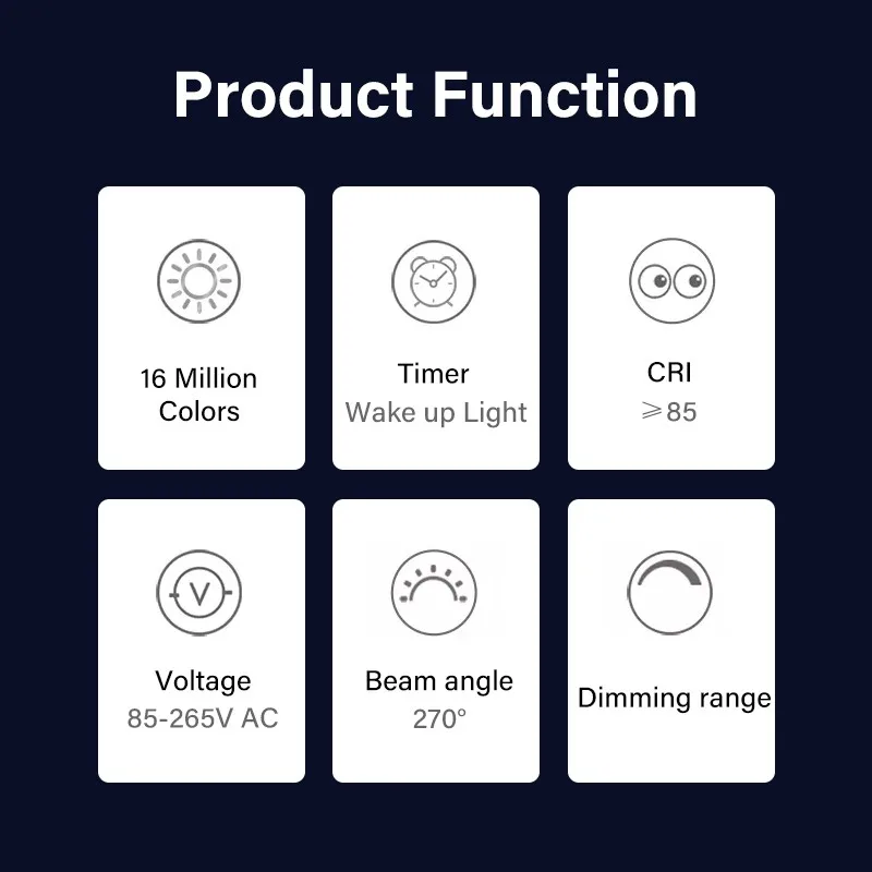 Вы можете установить различные режимы света на умной жизни, чтобы соответствовать различным поводам, включая кухню, гостиную, спальню. И наша умная лампочка также может использоваться для настольной лампы, кафе, бара, вечеринки и т. Д. И есть эти функции цветовая палитра, групповое управление, таймер, затемнение, режим DIY, режим сцены, энергосбережение...