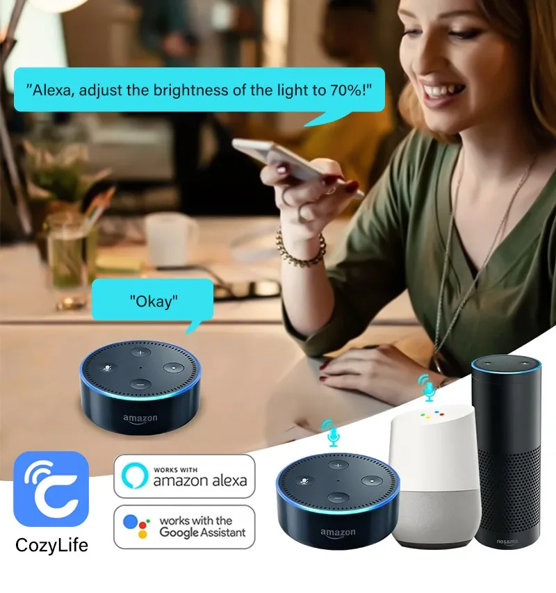 Простое Голосовое управление всеми умными лампами с помощью интеграции с Amazon Alexa Echo или Google Home Assistant, это включает в себя включение/выключение, яркость. Например, вы можете сказать: "Alexa переключает яркость смарт-ламп на 50 процентов".