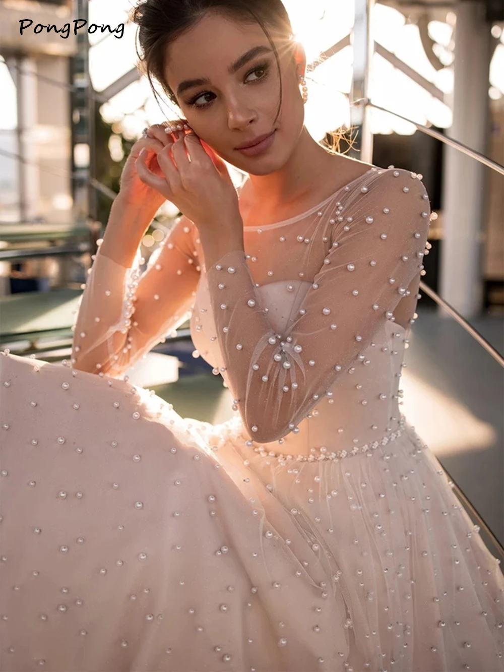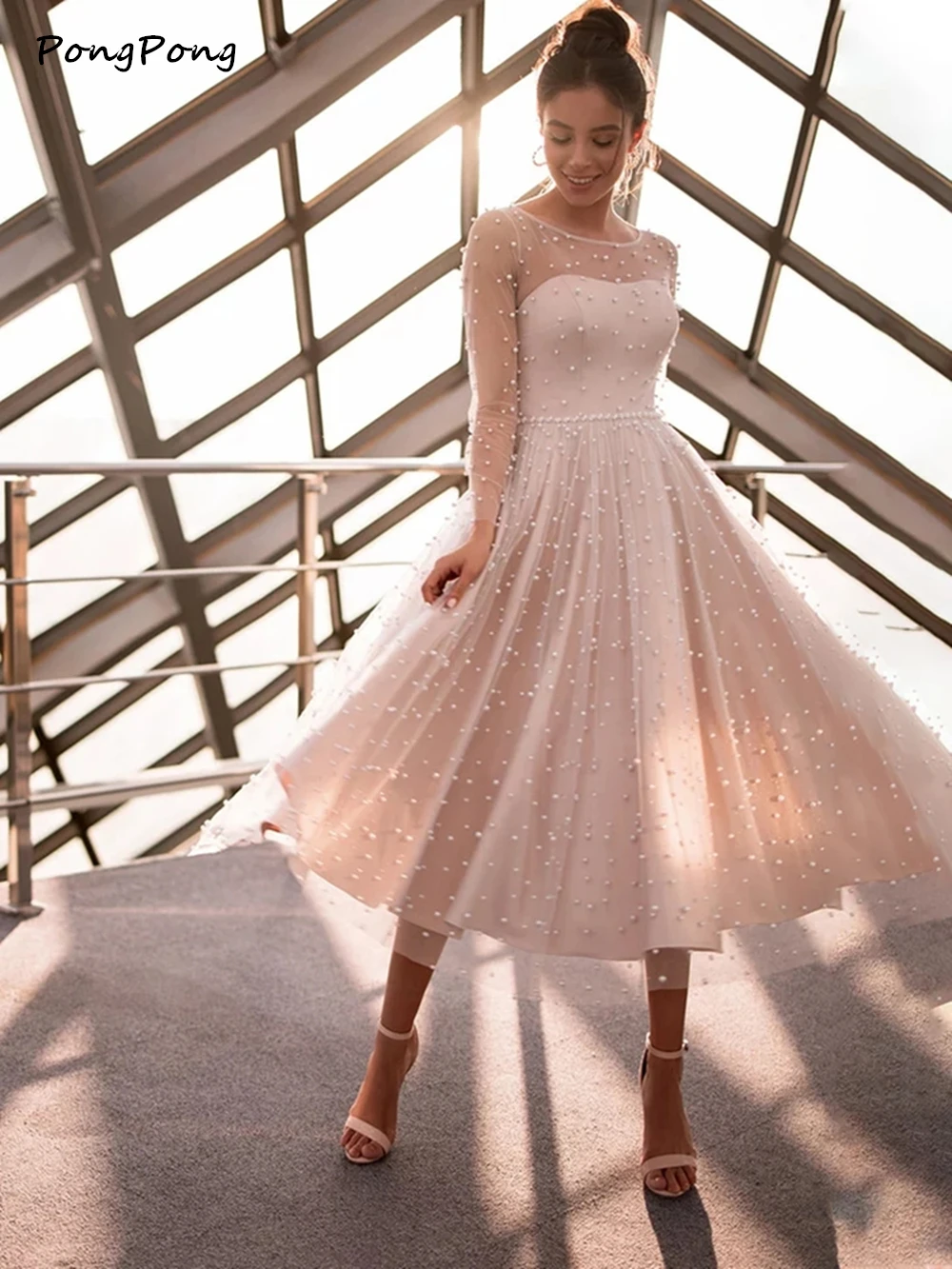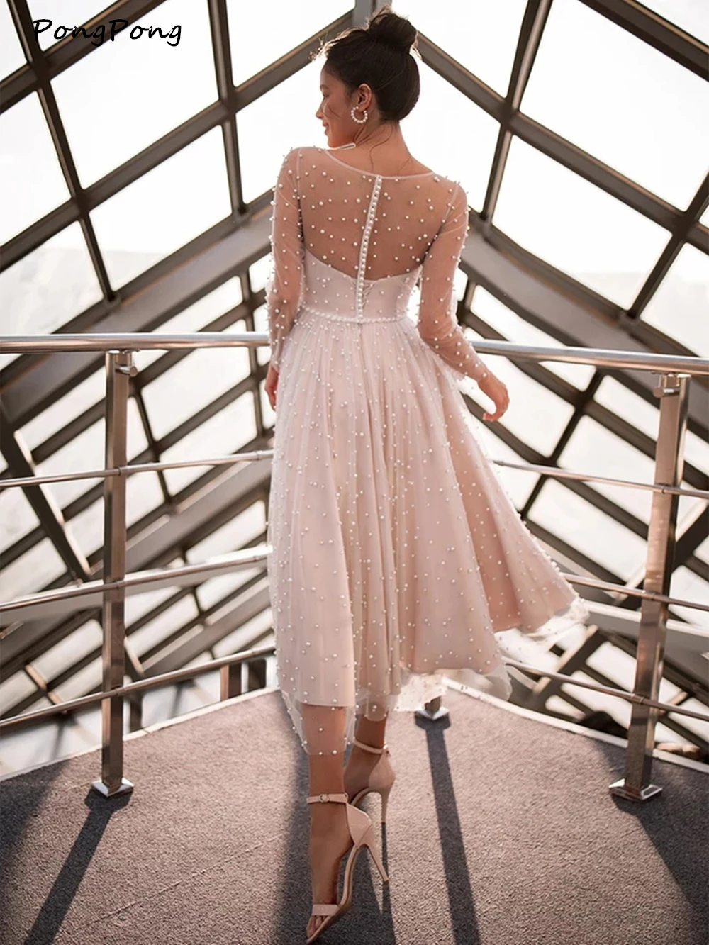 Короткое платье для свадебной вечеринки, скромное коктейльное платье до середины икры с розовыми жемчужинами, Прозрачное платье с длинным рукавом и круглым вырезом, Формальные платья для невесты