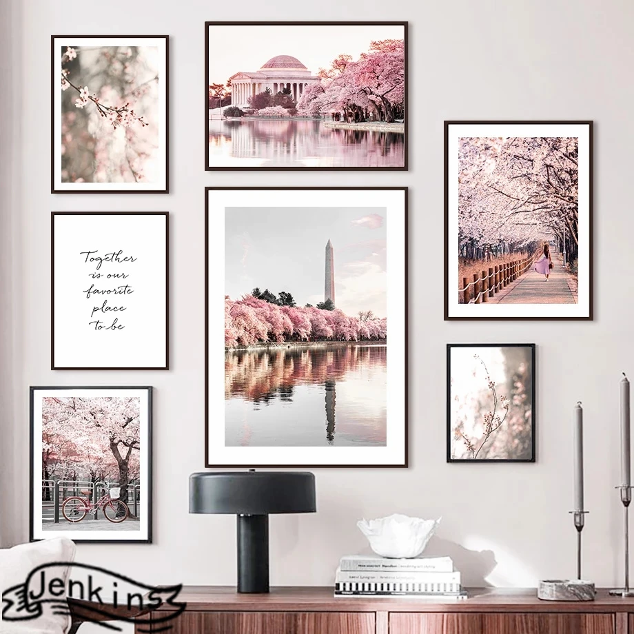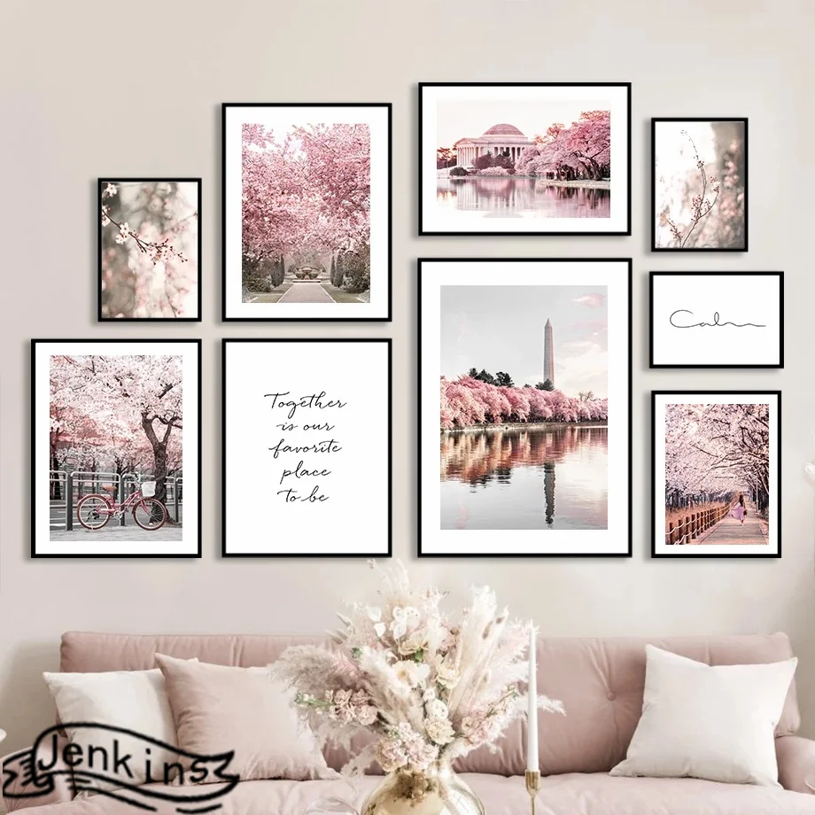 Постер на стену с изображением цветов розового сакуры для строительства девушки велосипеда, настенная Картина на холсте, принты в скандинавском стиле, картина для гостиной, домашний декор