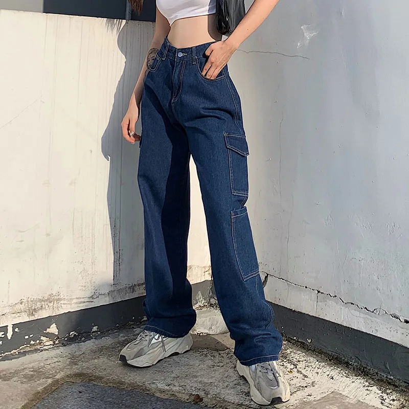 Джинсы Y2K женские с завышенной талией, модные брюки-карго из денима с карманами на застежке, штаны для друзей с широкими штанинами, уличная одежда, 2021