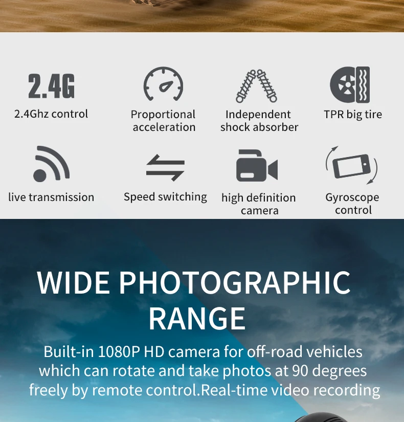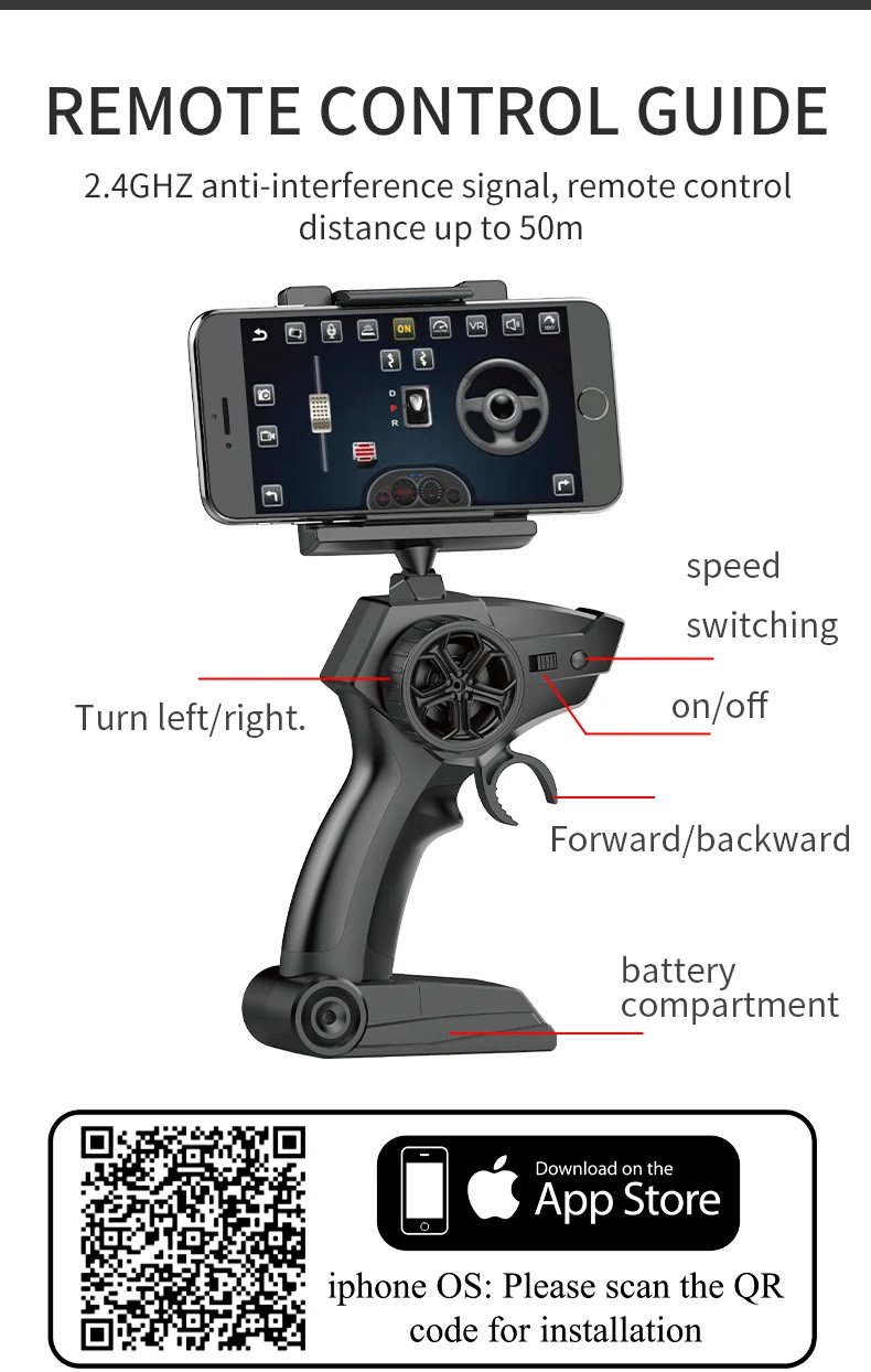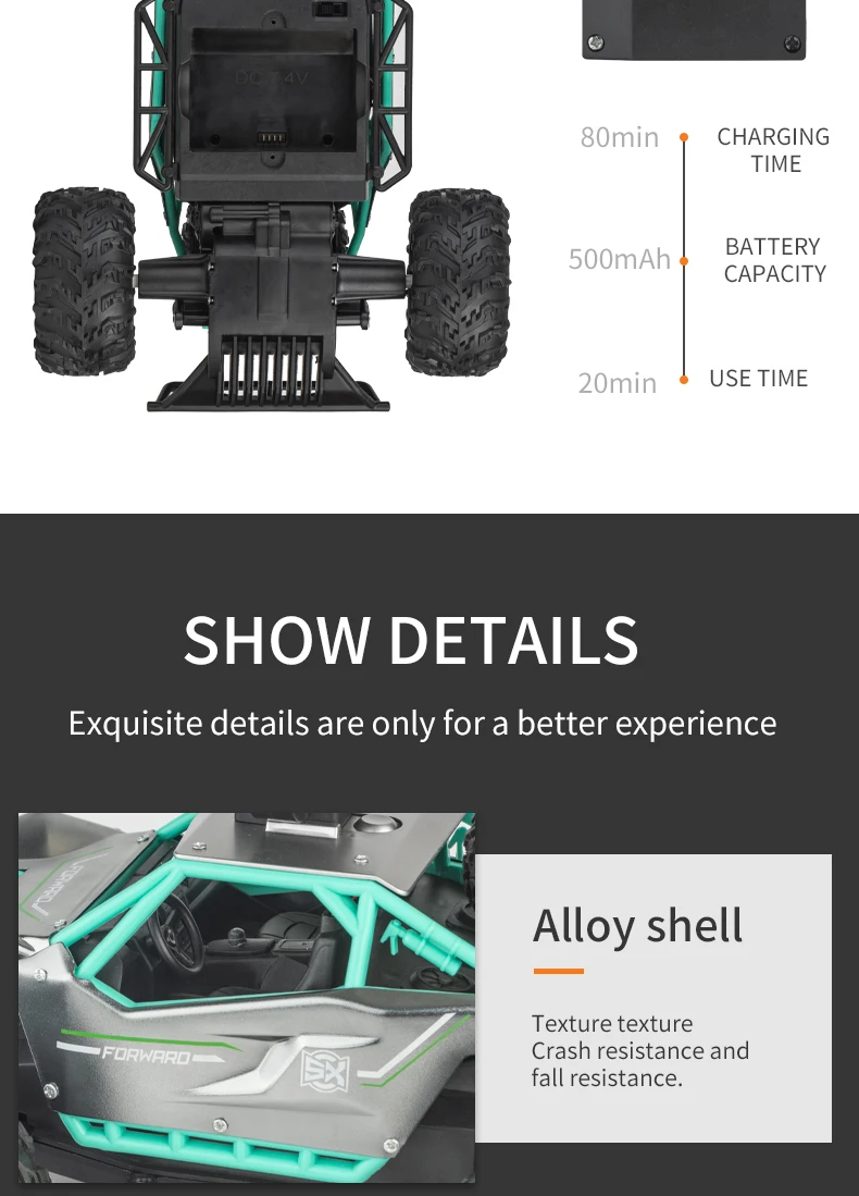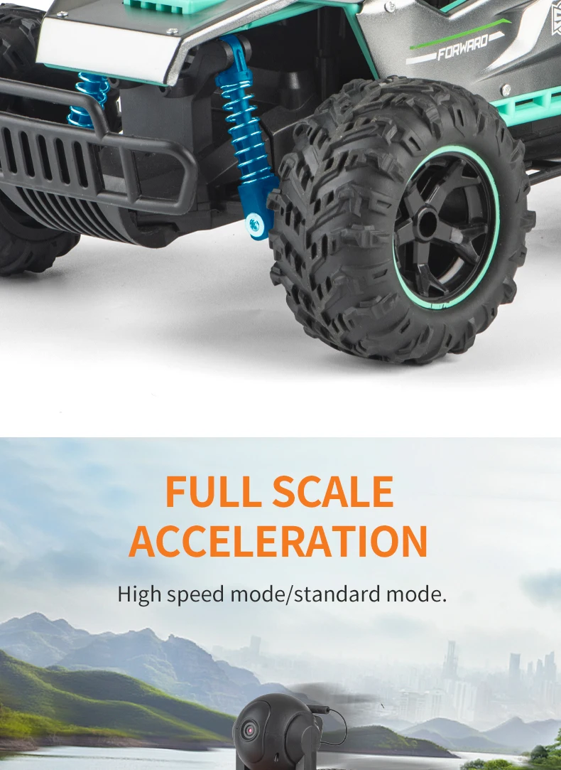 2: Этот продукт использует технологию дистанционного управления 2,4G и не мешает подобным продуктам. Мощная внедорожная альпинистская производительность, не ограниченная участком, будь то песок, грязь, камни, прочные горные дороги и т. д. симуляция управления структурой, вперед и назад, поворот влево и вправо