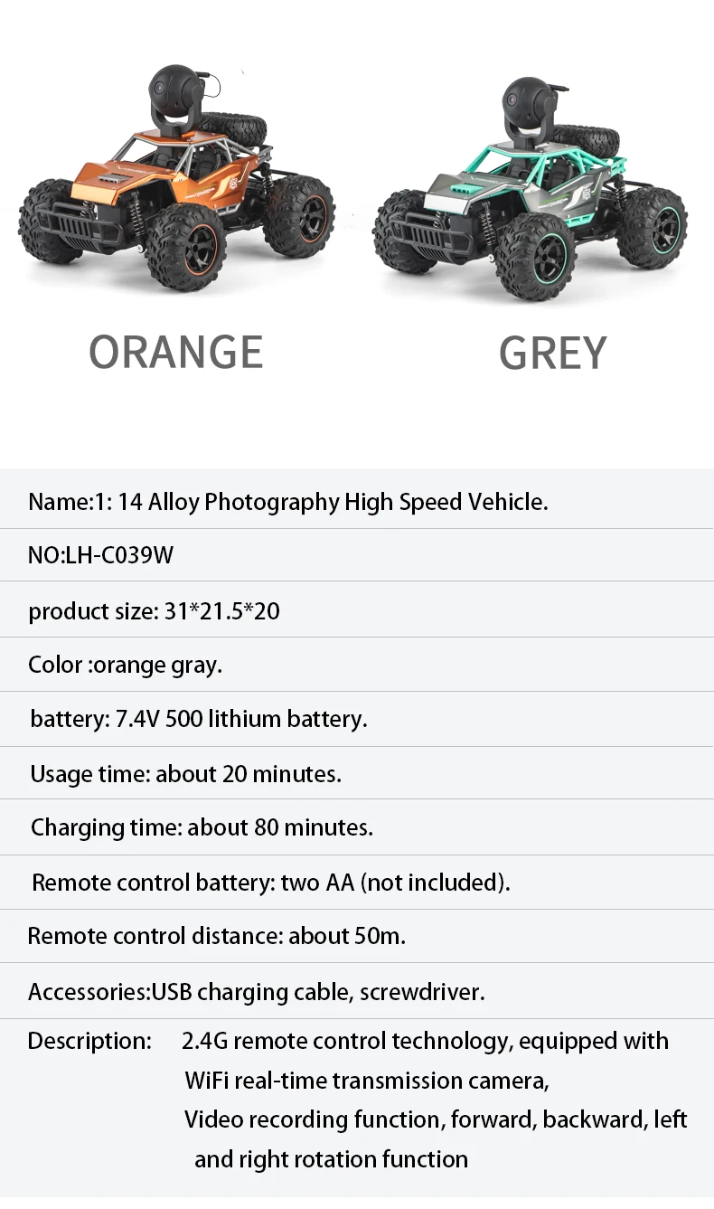 Соотношение тела: 1:12Размер продукта: 32*19,5*12 смРазмер цветной коробки: 32*20*21,2 смРасстояние R/C: около 100 метровВремя использования около 15 минутЧ/км/Максимальная скорость: 25 км/чСпособ зарядки: USB(6 в)Время зарядки: приблизительно 120-150 минутРасстояние передачи Wi-Fi: 35-40 метров (характеристики доступны только в стиле камеры)Функция продукта:Основные функции: дрейф/Скорость вперед/назад/левый поворот/правый поворотДополнительная функция: Передача изображений в реальном времени/фото/видео/мобильный телефон управление гироскопом/гравитационное определение (функции доступны только в стиле камеры)Аксессуар для продуктаВездеходные транспортные средства 1R/C X 1Зарядное устройство USB X 1Батарея (6v 500 мА · ч) х 1Инструкция X1HD cameraX1 (функции доступны только в стиле камеры)Пульт дистанционного управления для автомобиля без параметров камерыСоотношение тела: 1:18Размер продукта: 22,5*15,5*11 смНовый продукт пункт продажи: новый дизайн крутой пульт дистанционного управления; Обновление 260 мощный двигатель, больше мощности; Использовать большие шины, более сильное сцепление, прохладной формы; Пикапы. На крыше есть запасные шины, форма выглядит более реалистичнойМатериал изделия: ПВХ, АБС, электронные компонентыВремя использования: 15 минут или около тогоВремя зарядки: 2,5 часовРежим дистанционного управления: технология дистанционного управления 2,4G, расстояние дистанционного управления, до 100 метров в диаметреБатарея дистанционного управления: 2 секции "AA" (Принесите свой собственный)Корпус аккумулятора: Стандартный 4,8 V 700 mA никель-кадмиевый аккумуляторСкорость: 25 км/ч или около тогоРежим дистанционного управления: пульт дистанционного управления 2,4GПриводной двигатель: 260 Мотор, двухколесный приводЗарядное устройство: usb-кабель для зарядкиХарактеристики продукта: управление ручкой, ручная работа. Вперед и назад, поверните влево и вправо.Вес продукта: 0,8 кгСписок содержит:Автомобиль с дистанционным управлением * 1,Пульт дистанционного управления * 1,Батарейный блок * 1,Руководство по эксплуатации * 1,Usb-кабель для зарядки * 1.