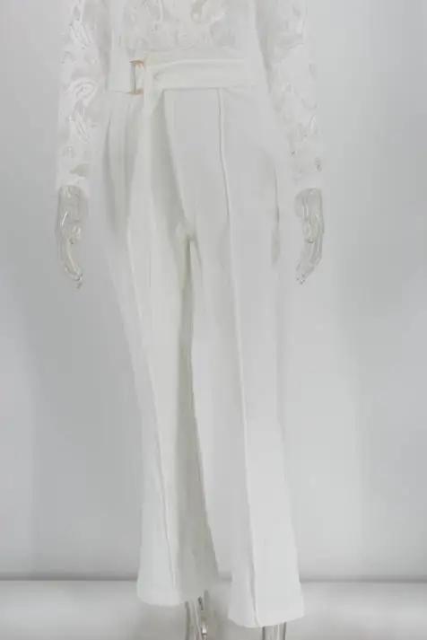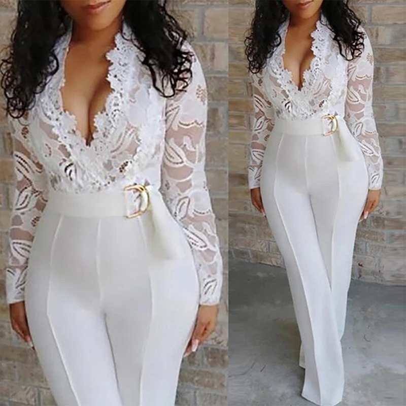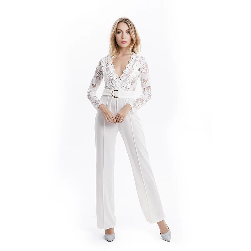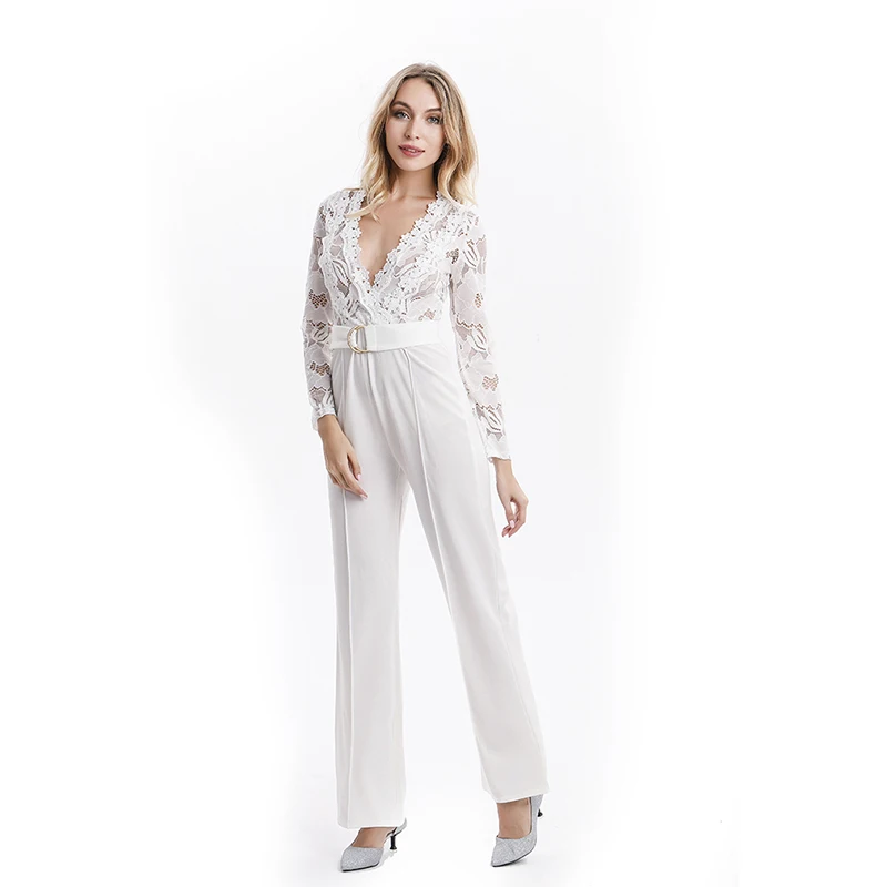 Женский офисный комбинезон с кружевом, белый комбинезон с длинными рукавами и V-образным вырезом, длинные брюки с широкими штанинами