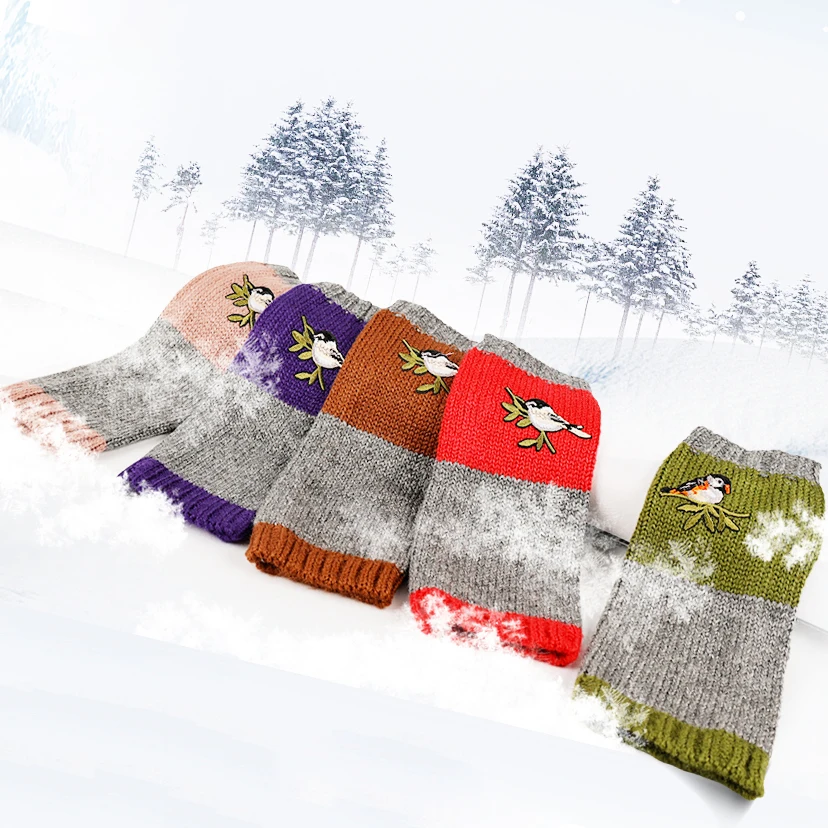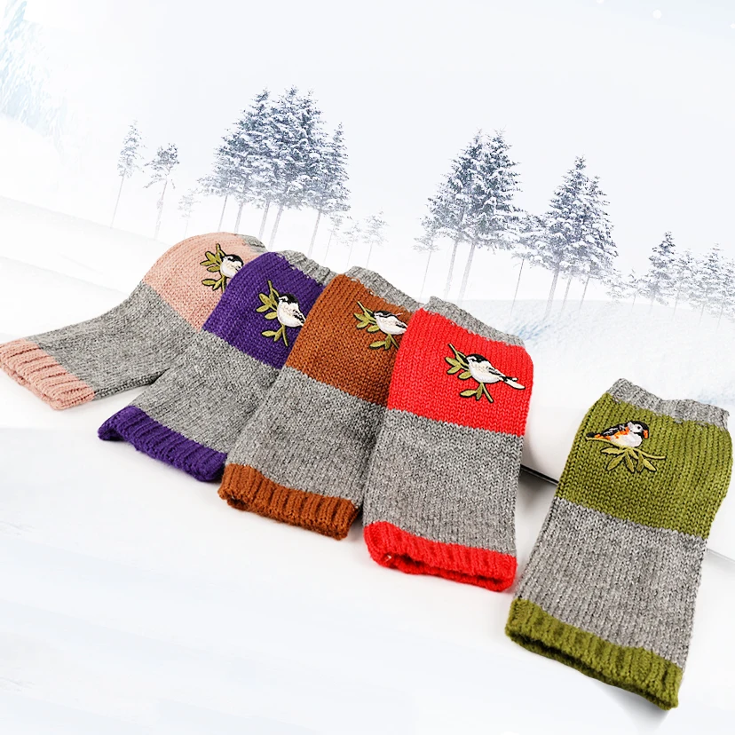 Перчатки с вышивкой в виде птиц, шерстяные вязаные перчатки без пал...