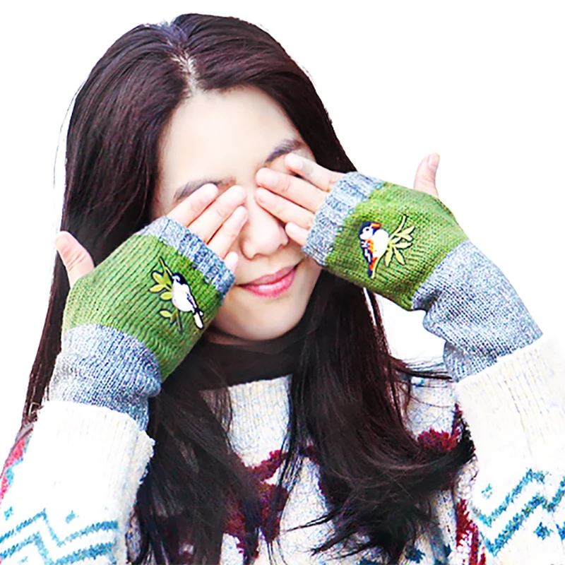 Вязаные перчатки с вышивкой птицы, варежки без пальцев для женщин, шерстяные вязаные блочные сращивающиеся перчатки, перчатки без пальцев для девочек