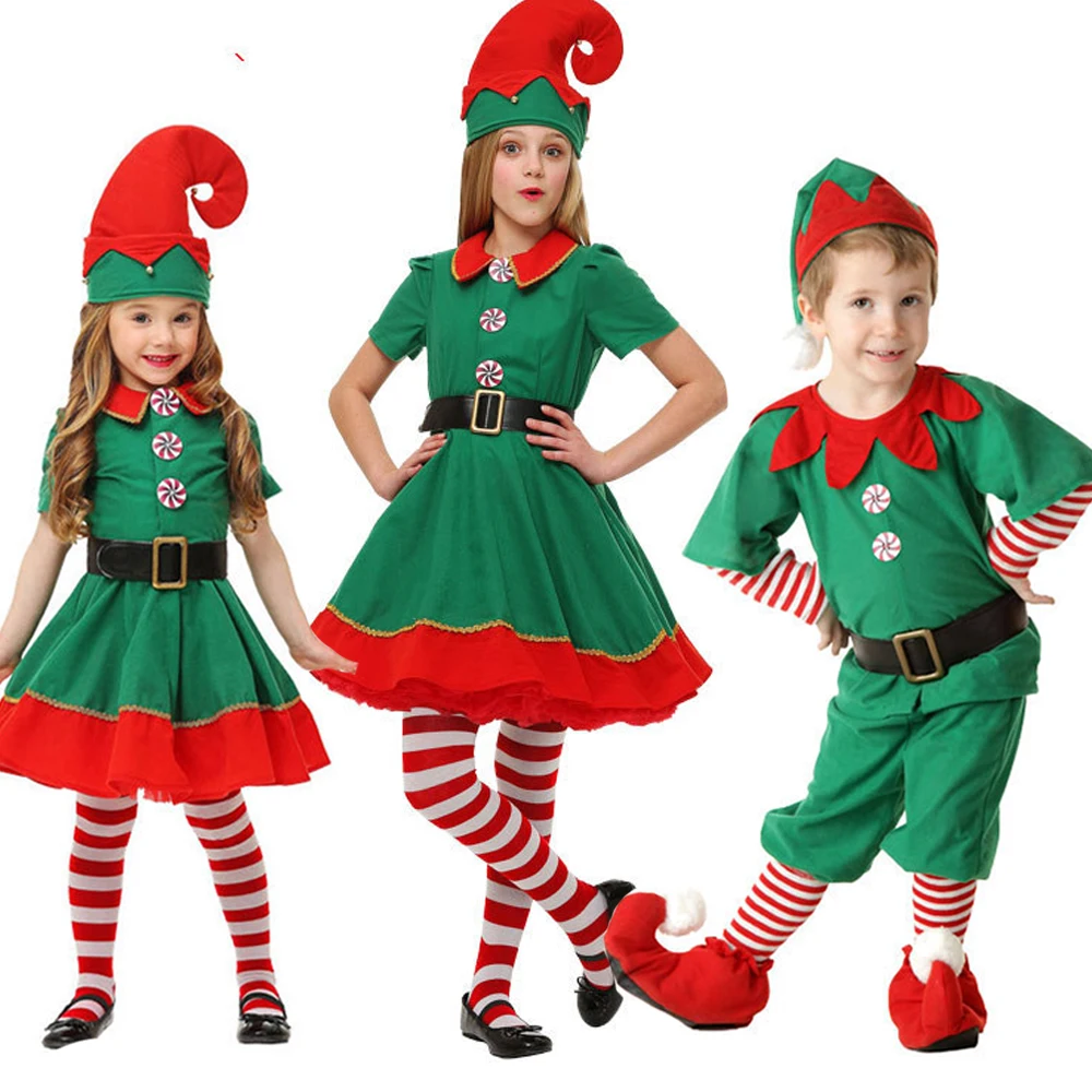 2021 Рождественский косплей для мальчиков и девочек Детский костюм эльф Санта Клаус Одежда для родителей и детей комплекты для взрослых Красная Зеленая одежда для Рождества