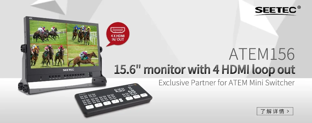 Особенности в деталяхФункции профессионального мониторингаSEETEC ATEM156 создала профессиональные функции мониторинга в соответствии с фактическими потребностями предварительной съемки и пост-производства, чтобы помочь вам повысить эффективность стрельбы. Оснащен четырьмя входами 4K HDMI, он поддерживает четырехъядерный вид, двойной вид и функции мониторинга одного вида, что позволяет вам получить идеальный мониторинг нескольких камер в любом месте! Он содержит функции проверки фокуса, такие как пикающий фокус, ложный цвет и пиксель на пиксели, чтобы помочь в получении острых изображений. Он содержит функции обрамления, такие как центральный маркер, маркер безопасности, маркер сетки, чтобы предотвратить вырезание экрана во время жизни, чтобы оставить правильное место для других функций во время жизни. Он также включает в себя другие полезные функции, такие как увеличение изображения, поле проверки, замораживание изображения, Регулировка цветовой температуры и т. д.15,6» ЖК-дисплей, Full HD 1920x1080SEETEC ATEM156 оснащен 15,6 дюймов IPS ЖК-дисплей панель. Сама ЖК-панель IPS имеет разрешение 1920x1080, Контрастность 800:1 и светодиодный светильник с яркостью 250 кд/м2, предоставление вам точного воспроизведения видео. Он сочетает широкий угол обзора 170 ° как в горизонтальном, так и в вертикальном направлениях. Простота просмотра обеспечивается за счет уменьшения изменения цвета из-за угла обзора.Истинный цвет. Профессиональная калибровка цветаИспользуйте Rec.709 стандарт цветаSEETEC использует профессиональный стандарт цвета Rec.709 HD и использует технологию калибровки цвета, с профессиональной калибровкой инструмента на заводе, он может эффективно достичь калибровки монитора и легко получить точную цветопередачу, не искажайте цвет, показывайте реальное изображение при съемке видео.Точная цветопередачаМонитор SEETEC поддерживает стандарты ITU и HD видео Rec.709 стандартное последовательное цветовое пространство, передовые технологии обработки изображений, так что изображение четко представлено, цвет чрезвычайно естественный, чтобы обеспечить точную цветопередачу, чтобы воспроизвести физическую природу съемки, позволяя пользователям точно оценить качество различных входных видеосигналов.Простое управление кнопкамиКогда вы заняты на сцене съемки, вы должны быть в состоянии легко управлять оборудованием, и ATEM156 может удовлетворить ваши потребности. Он оснащен простой панелью управления, что позволяет вам чувствовать себя комфортно в процессе съемки. С 4 раздельными кнопками HDMI вы можете быстро переключить источник сигнала HDMI; С 4 кнопками быстрого доступа (F1 ~ F4), вы можете настроить функции клавиш быстрого доступа и быстро позвонить им.4X4K HDMI входы и выходыПодключите до 4 камер, игровых консолей или компьютеров!ATEM156 имеет 4X4K HDMI вход и выход, которые могут подключаться к 4 камерам, игровым консолям, компьютерам и другому оборудованию. В то же время он также может подключать 4 HDMI сигнала к другим устройствам, таким как ATEM Mini или ATEM Mini Pro. Это очень полезно для студийной и живой съемки с несколькими камерами.Реализовать атем мини мультипросмотр мониторингаКогда ваш коммутатор не имеет функции мультипросмотра, такой как ATEM Mini, вам может потребоваться ATEM156. При работе с несколькими камерами в режиме реального времени вы можете сначала подключить камеру к монитор