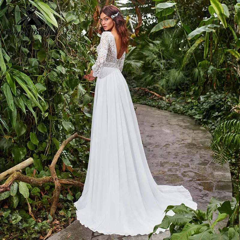 Женское свадебное платье Behemian в стиле бохо, Пляжное шифоновое платье с длинным рукавом, V-образным вырезом, открытой спиной и шлейфом, свадебное платье невесты