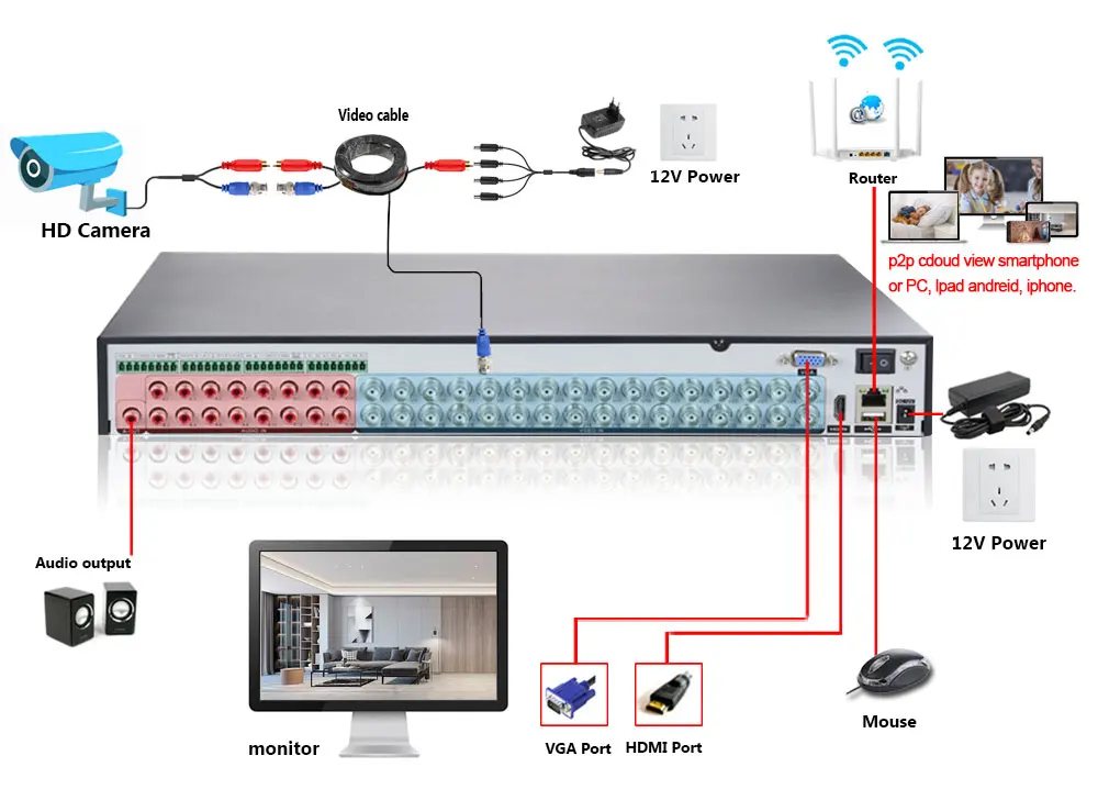 Простая настройка, всего 4 шага для просмотра мобильный телефон, просмотра видео в режиме реального времени из любого места и в любое время с помощью смартфона, стола или ПК с передовой технологией P2P, вы можете получить удаленный доступ к вашей системе за считанные минуты или меньше, нет необходимости в переадресации, удаленный доступ никогда не был таким простым!