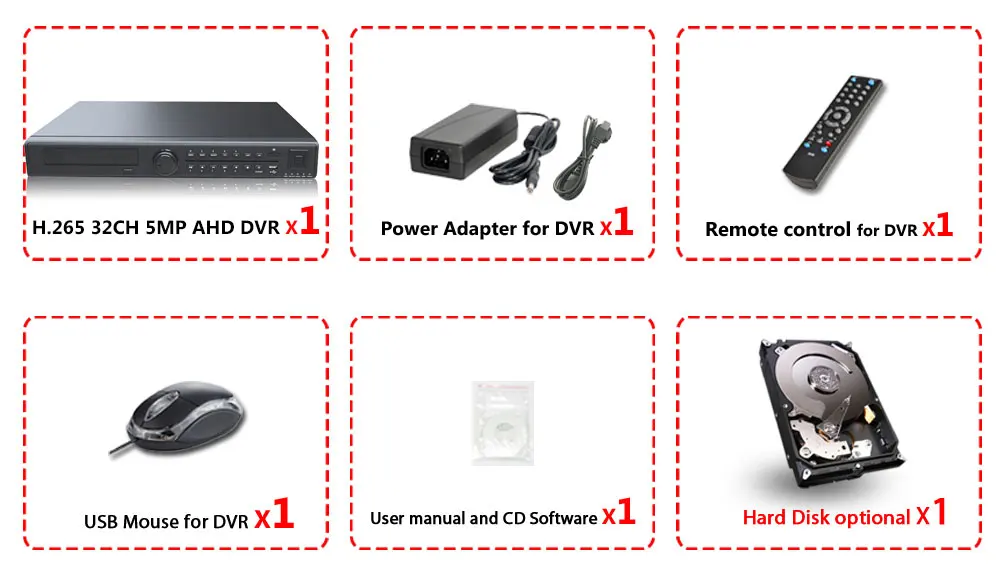1 х H.265 32CH 5MP 6 в 1 AHD DVR гибридный цифровой видеорегистратор1 x Блок питания для DVR1 х USB мышь для DVR1 X CD программное обеспечение для DVR1 X пульт дистанционного управления для DVRЖесткий диск включен дополнительно!