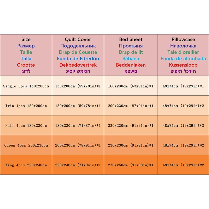 ★★Один 3 шт 150x200 см:☛Крышка Duver: 150x200 см * 1☛Плоский лист: 160x230 см * 1☛Наволочка: 48x74 см * 1★★Twin 4 шт. 150x200 см:☛Крышка Duver: 150x200 см * 1☛Плоский лист: 160x230 см * 1☛Наволочка: 48x74 см * 2★★Полный 4 шт 180x220 см:☛Крышка Duver: 180x220 см * 1☛Плоский лист: 230x230 см * 1☛Наволочка: 48x74 см * 2★★Королева 4 шт. 200x230 см:☛Крышка Duver: 200x230 см * 1☛Плоский лист: 230x230 см * 1☛Наволочка: 48x74 см * 2King 4 шт. 220x240 см:☛Крышка Duver: 220x240 см * 1☛Плоский лист: 230x250 см * 1☛Наволочка: 48x74 см * 2