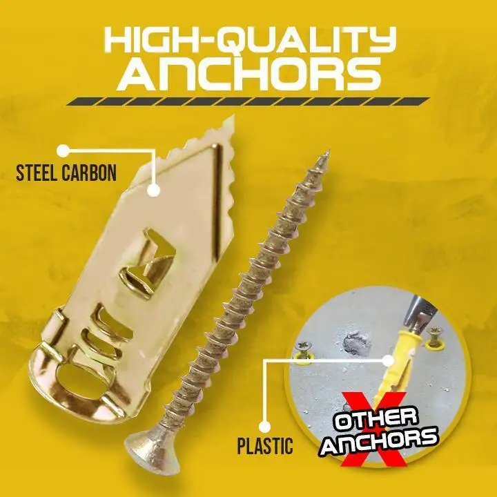 Саморезы Из углеродистой стали с цинковым покрытием для прочной конструкции и максимальной прочности. По сравнению с универсальным пластиковым якорем, нет необходимости сверлить отверстия на стене, предотвратить любые повреждения для стены и без отверстия, оставленного после использования. Кроме того, коническая острая головка позволяет проще устанавливать и удалять, экономя энергию.