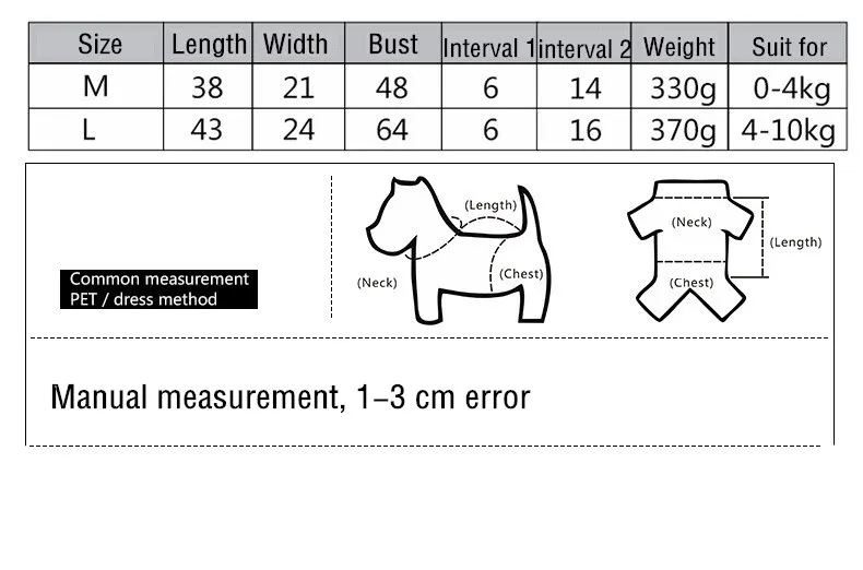 1. Пожалуйста, измерьте вашего питомца перед покупкой, уделяя особое внимание таблице размеров.2. Пожалуйста, основываясь на измеряемом размере, предлагаемый вес только для справки.3. Возможны незначительные отклонения в данных измерений из-за ручного измерения.4. Измерение размера позволяет помещать 2 пальца между изделием и собакой.