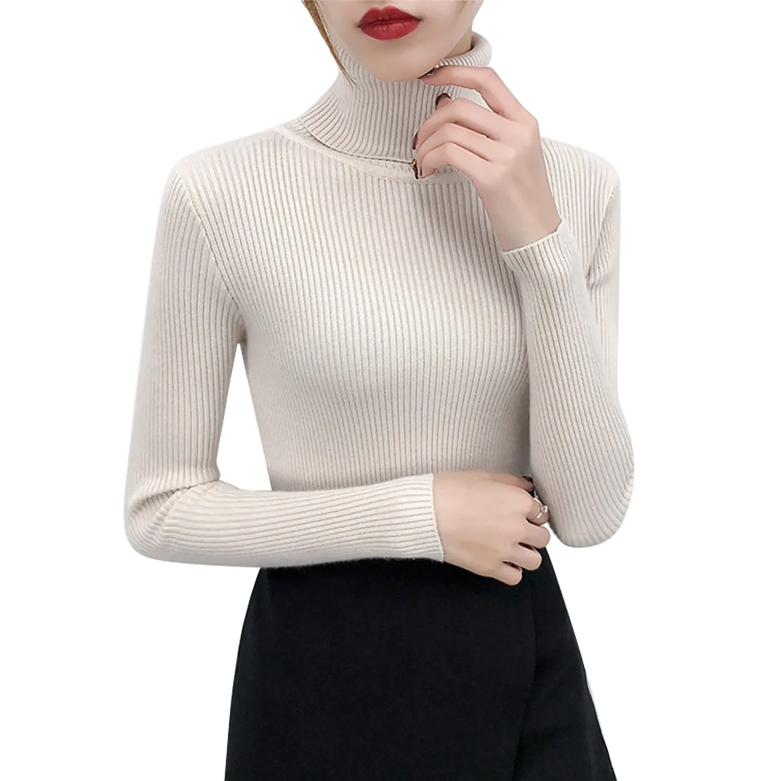 Женский модный однотонный свитер с длинным рукавом и воротником под горло, свободный трикотажный пуловер из овечьей шерсти