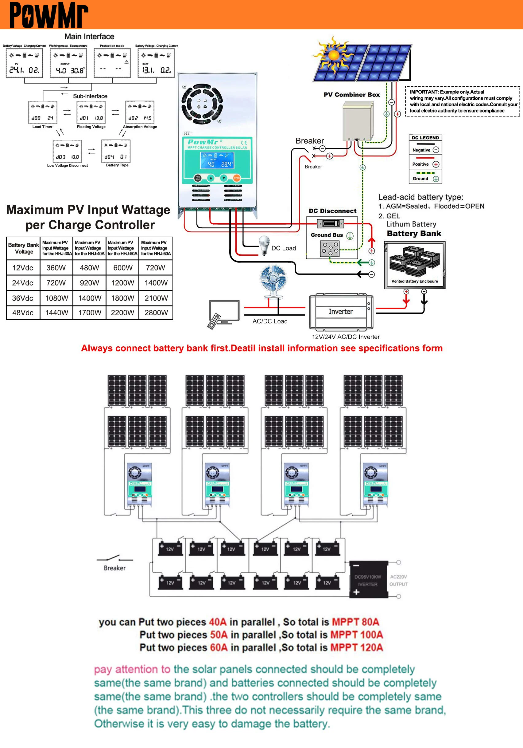 Максимальная входная мощность PV (Общая номинальная мощность PV не может превышать этот Ватт, который сломает контроллер.)