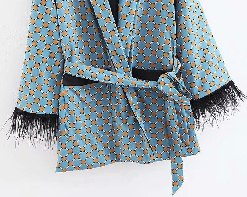 JESSIC с голубым принтом кимоно куртка и головной повязкой с пером ...