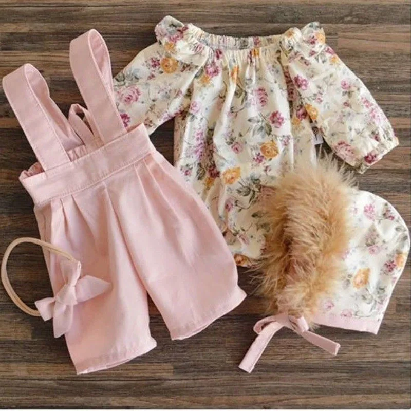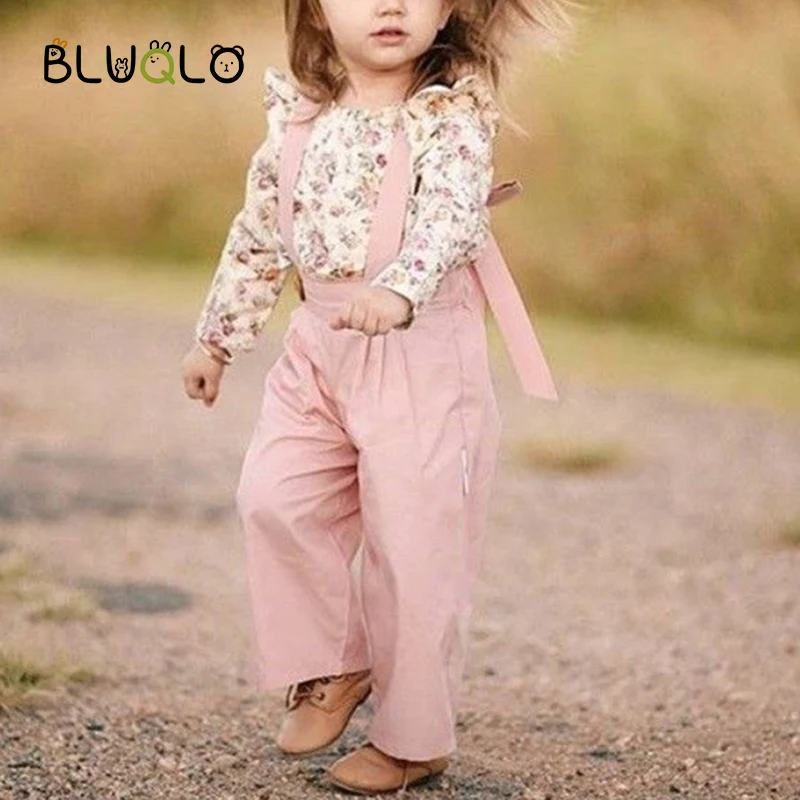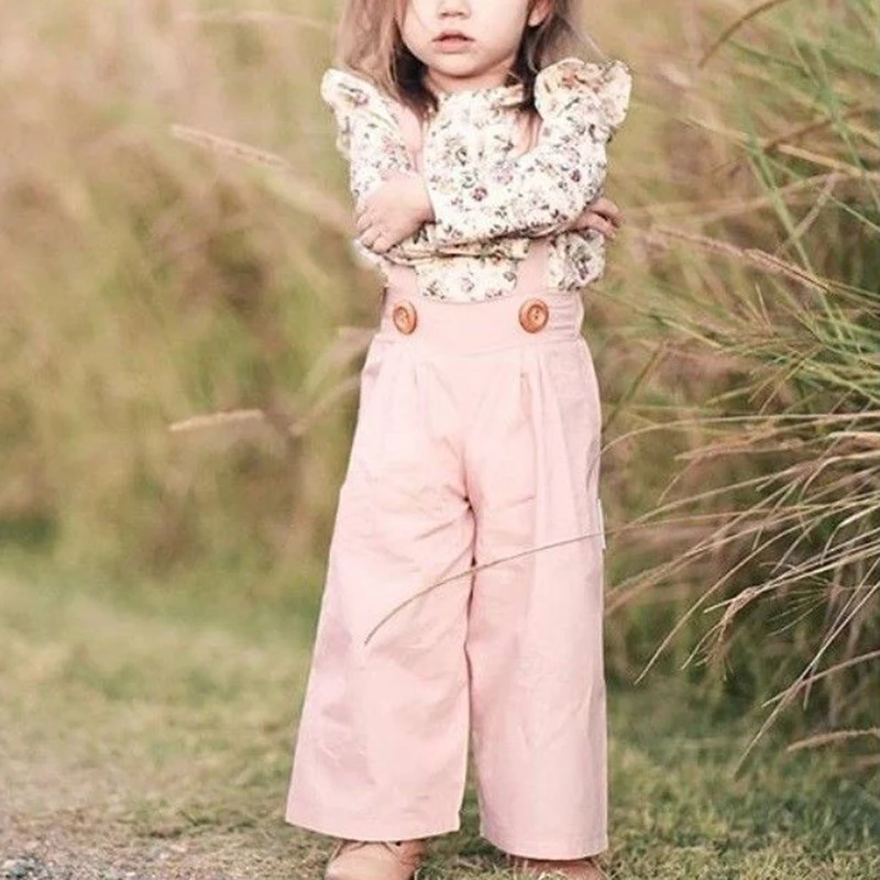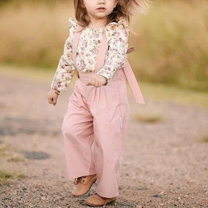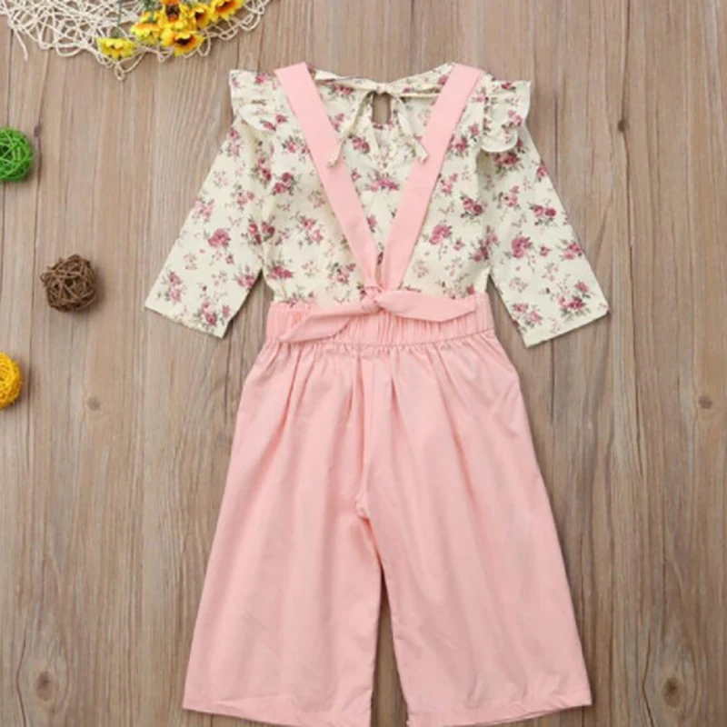 Модный комплект одежды для маленьких девочек из 2 предметов, летняя блузка с цветочным принтом, рубашка, комбинезоны, брюки, комплекты с милой юбкой с рукавами-лепестками