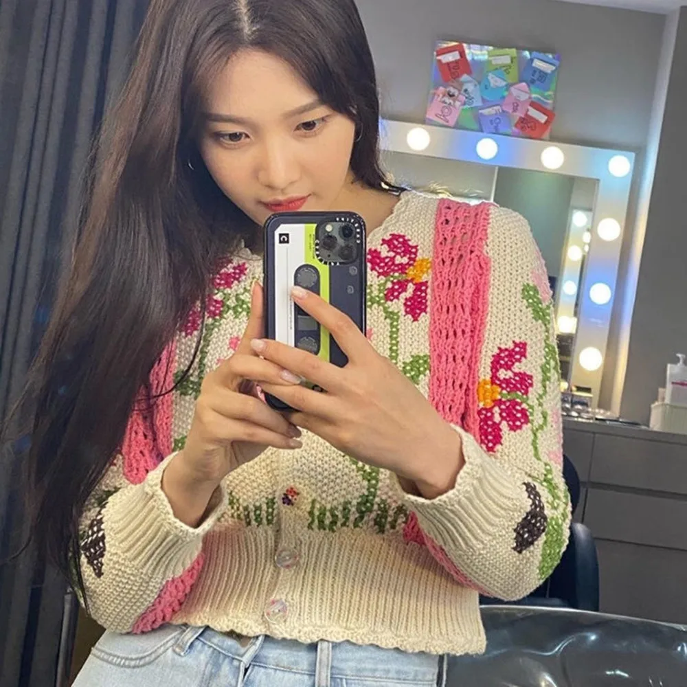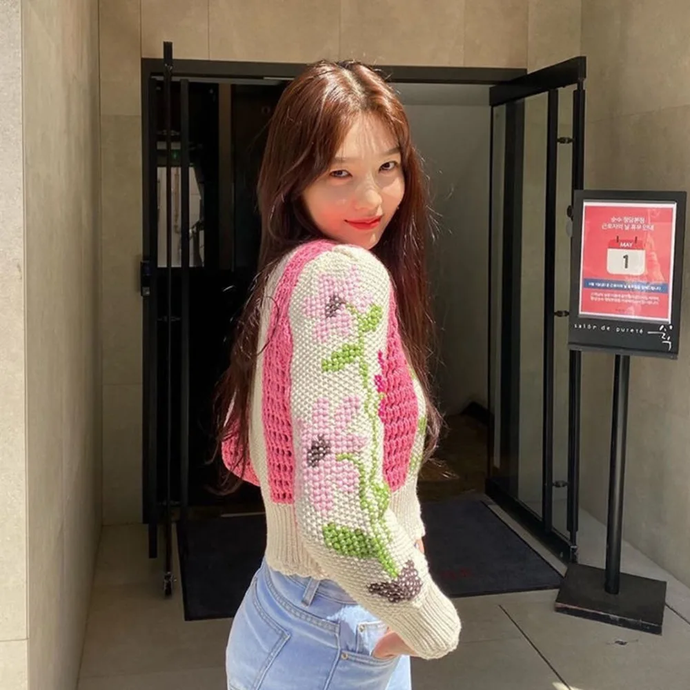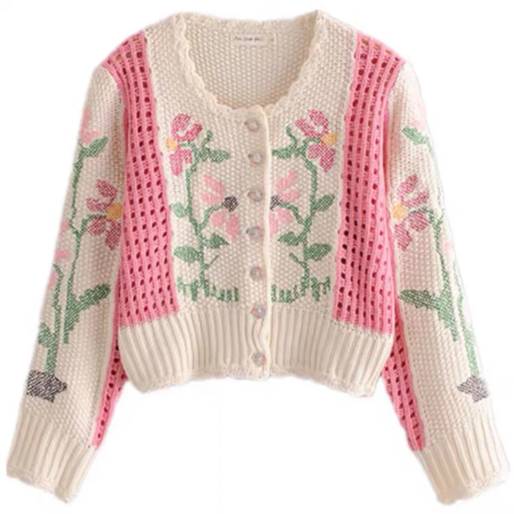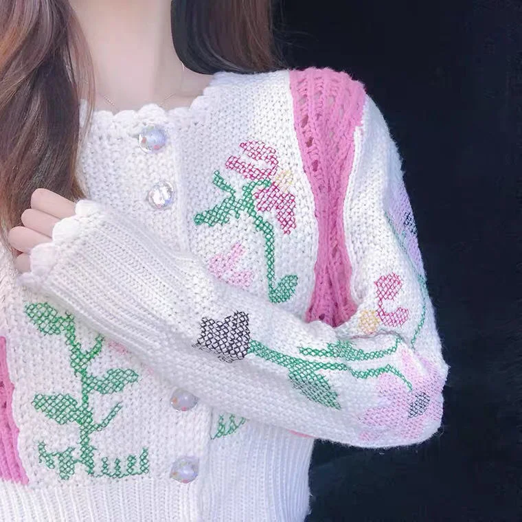 Женский трикотажный свитер-кардиган, винтажный мягкий свитер во французском стиле с цветочным принтом, ажурный кардиган в Корейском стиле, Y2K, зима