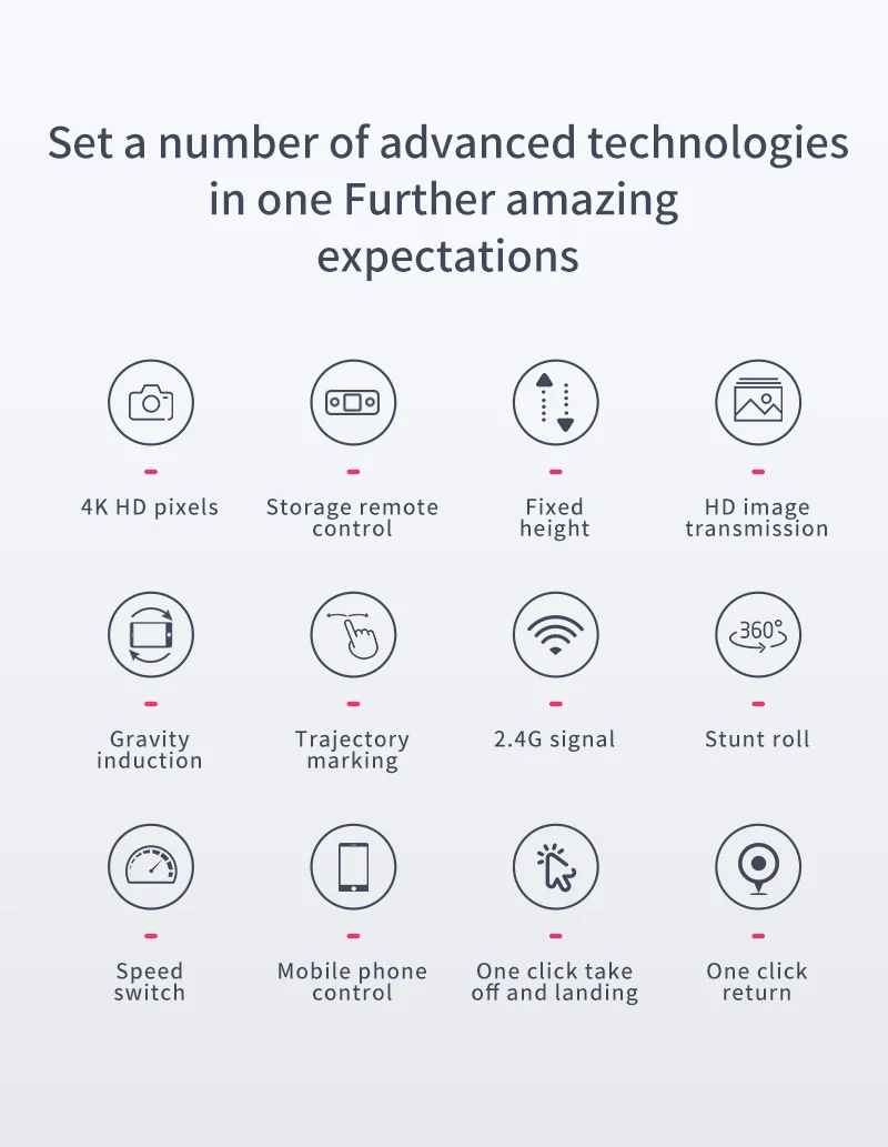 Номер: KY905Материал: АБС-пластик и электронные компонентыЦвет: серыйВерсия: без камеры, включая камеру 1080P, включая камеру 4K/(опционально)Гироскоп: 6 осейЧастота: 2,4GКанал: 4CHМотор: 716 бесщеточный без сердечникаБатарея: 3,7 V 600MAH литиевая батарея (входит в комплект)Мощность передатчика: 3 батарейки AA (не входят в комплект)Режим передатчика: режим 2 (левая дроссельная заслонка)Время полета: около 10 минутВремя зарядки: 70 минутДистанция RC: 150 мРасстояние FPV: 30-50 мFPV: WiFiРазрешение: 1080P, 4KУгол камеры: фиксируется на 25 °Квадрокоптер Размер: 10*10*3 см (в разложенном виде) 7,5*6*3 см (в сложенном виде)Характеристика:-Складные руки, компактные и легко переносятся.-Режим удержания высоты, стабильный полет.-В безголовом режиме нет необходимости регулировать положение самолета перед полетом.-Используйте функцию возврата одной кнопкой, чтобы легко найти путь домой.-Камера высокой четкости 4K пикселей. Удивительно, но он может снимать Потрясающие фотографии и видео с неба.-С функцией Wi-Fi вы можете подключиться к приложению, системе APK и делать фотографии, видео и передачу в режиме реального времени через Изображение камеры телефона.-Нарисуйте траекторию полета на экране, и Дрон будет летать автономно по указанному пути.-2,4 ГГц анти-помех технологии.-4 подъем, спуск, вперед, назад, летите налево, летите направо и 360 °» прокатки каналов.-Шестиосевой гироскоп, полет более стабильный и более удобный контроль.-Светодиодный светильник делает полет более эффектным, особенно в темноте.Функции: вверх/вниз, вперед/назад, влево/вправо, боковой полет, светодиодный свет, Безголовый режим, автоматическое возвращение одной кнопкой, режим удержания высоты, WiFi FPV. Визуальное позиционирование. Переключение камеры.Посылка включает в себя:Корпус * 1Пульт дистанционного управления * 1Руководство * 1USB кабель * 1Защитный круг * 4Запасной главный вентилятор * 4Отвертка * 1