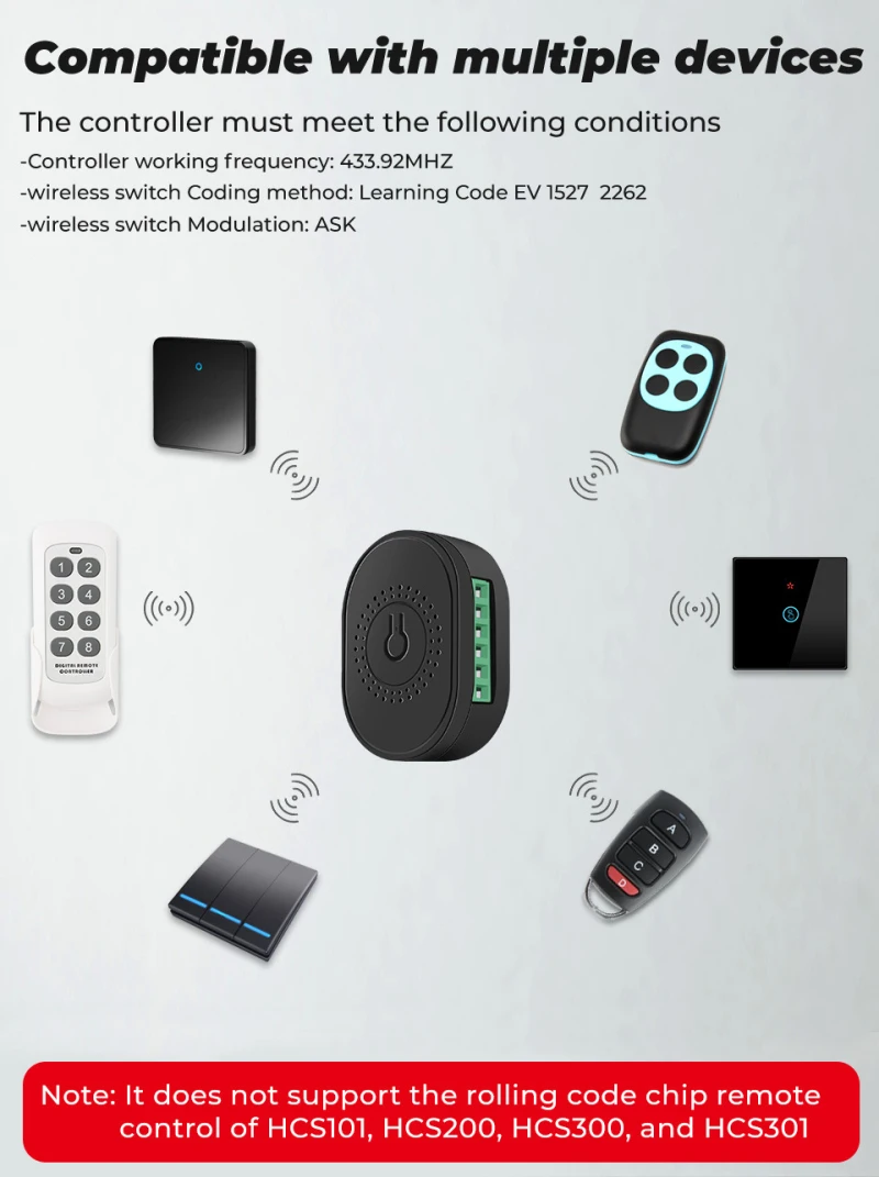 Модуль переключателя и беспроводной переключатель RF433 приобретаются отдельно.