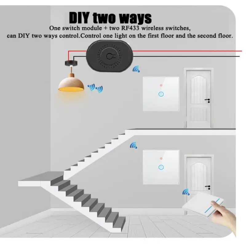 【Поддержка двухстороннего управления 】 может использоваться с двухсторонним механическим переключателем перед подключением к дому. Один модуль переключения плюс две беспроводные панели RF433 можно сделать двумя способами s DIY. Вы можете управлять светильник на первом и втором этажах без изменения проводов дома!