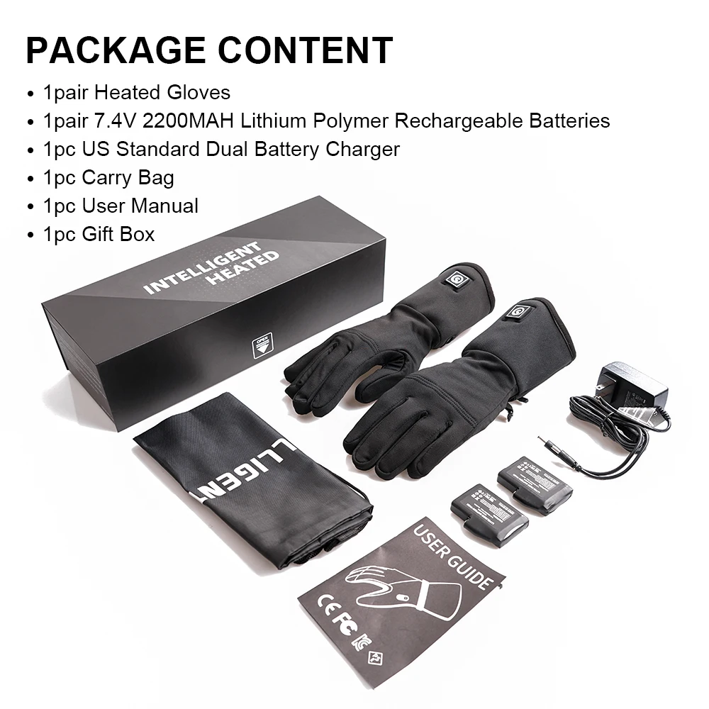 Посылка включает в себя:1 пара перчаток.2 батареи.1 двойное зарядное устройство с США, ЕС, Великобритании и Австралии.1 переносная сумка/чехол для переноски.1 Инструкция по эксплуатации.