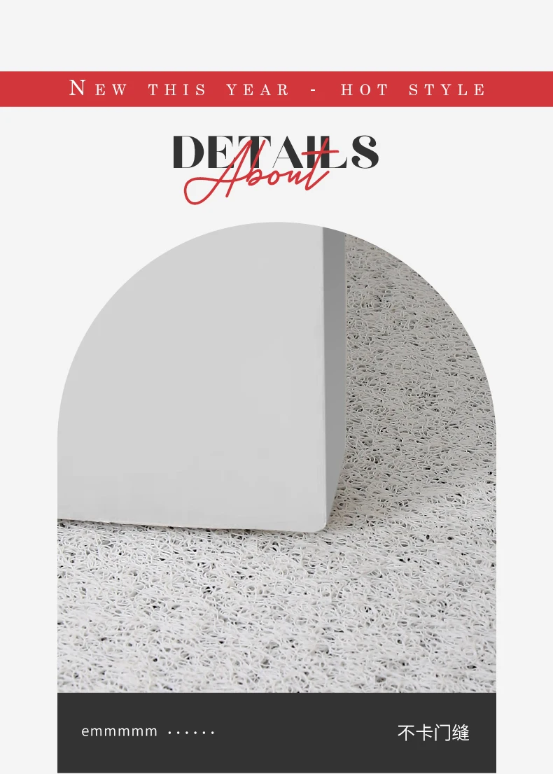 Коврик из ПВХ с шелковой петлей может предотвратить скольжение и защитить вашу безопасность, он может поглощать влагу из вашей обуви, чтобы сделать пол чистым и сухим, а также очистить от пыли, грязи, снега, И т. д.Его можно свободно разрезать на любые формы, которые вы хотите, и он подходит для внутреннего и наружного входа, прихожей, гостиной, спальни, ванной комнаты и т. д.Толщина коврика составляет около 8 мм, он может полностью лежать на полу и не препятствует открыванию и закрытию двери.Когда коврик заполнен частицами грязи, вы можете просто очистить его с помощью пылесоса или использовать водяной шланг в краску, а затем дать ему высохнуть на воздухе перед следующим использованием.