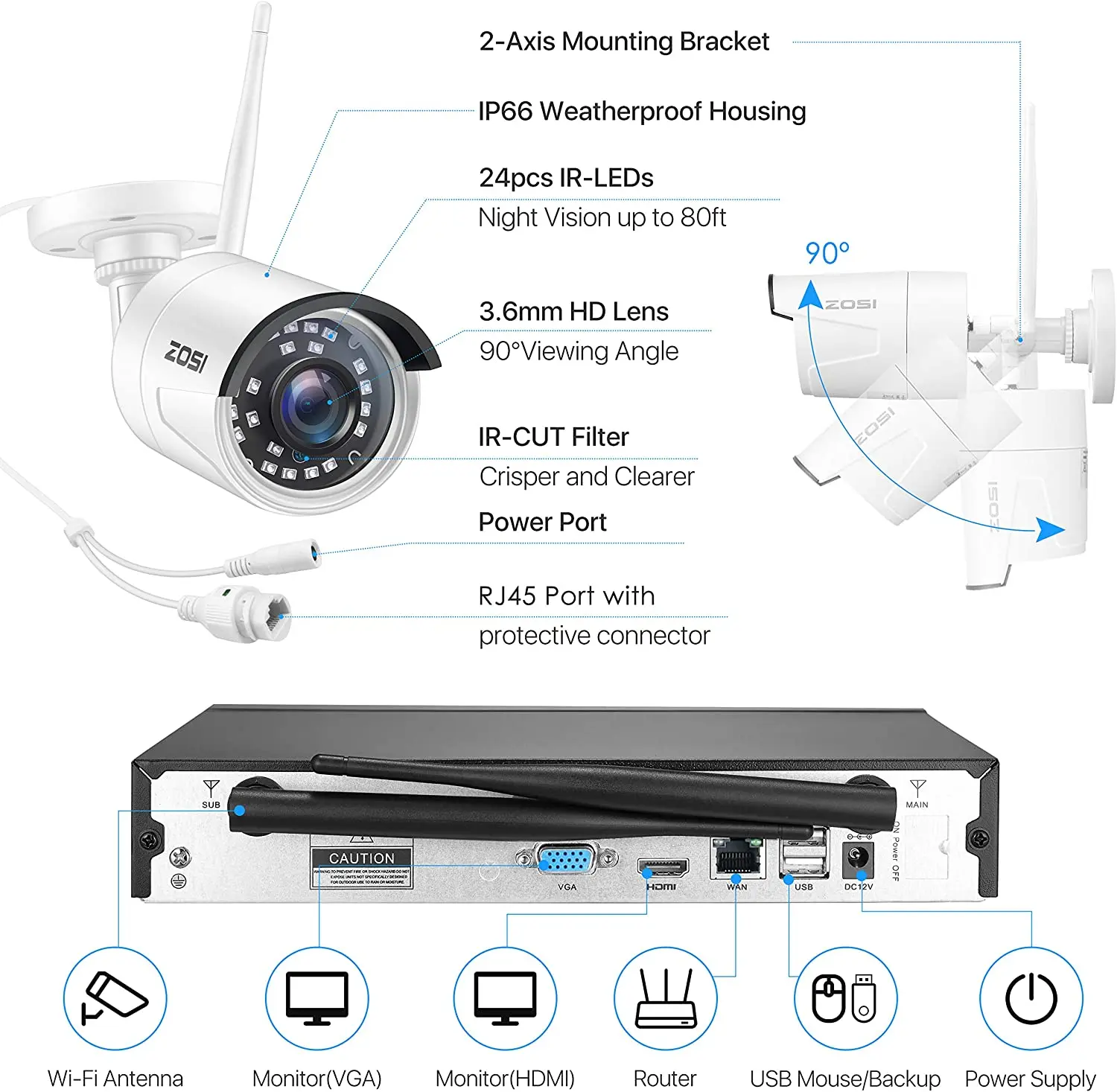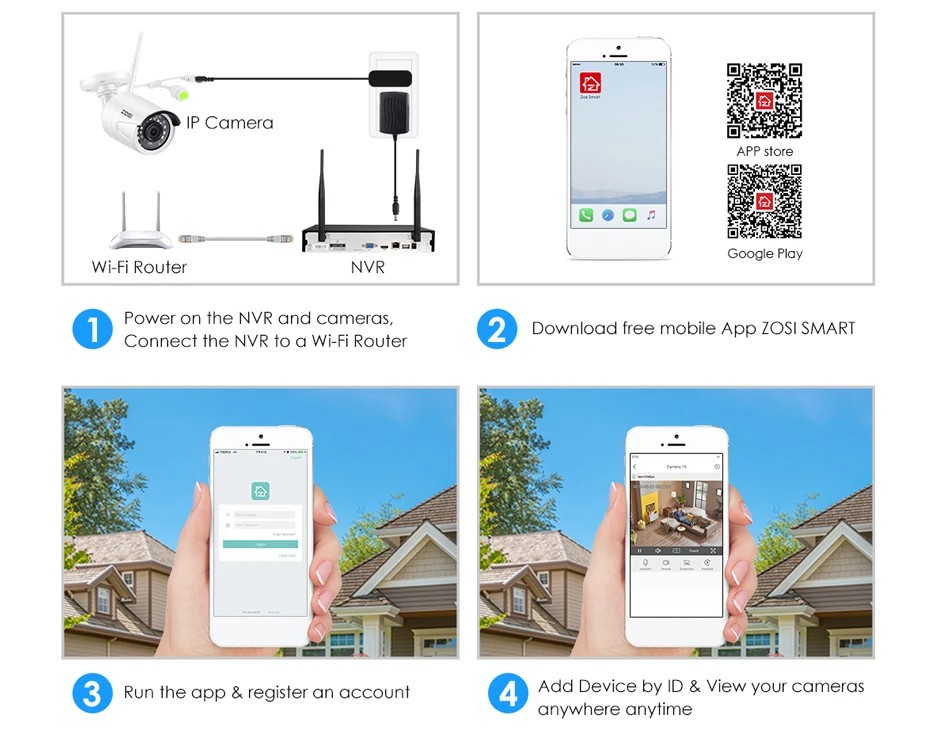 Удаленный просмотр: Загрузите приложение ZOSI Smart на свой смартфон (iOS или Android), вы также можете просмотреть просмотр в реальном времени с компьютера через клиент AVSS PC.