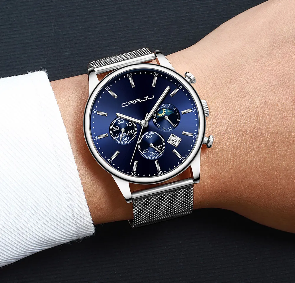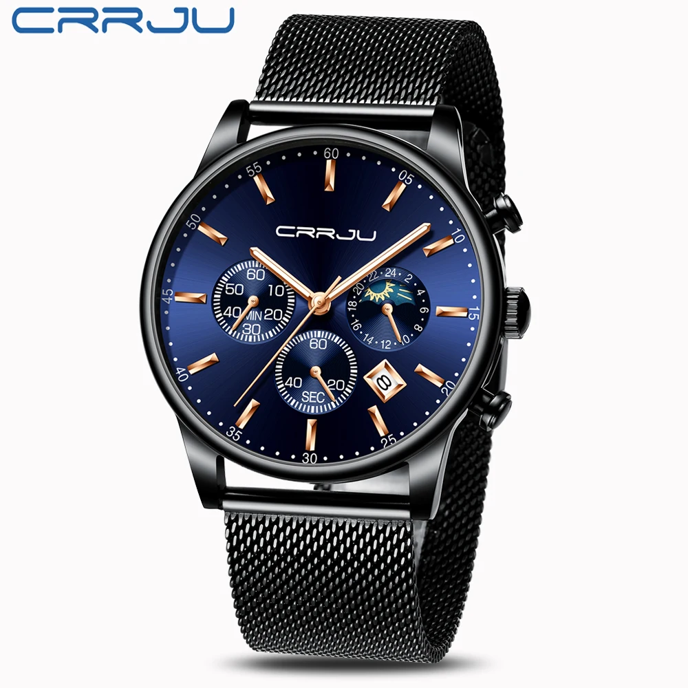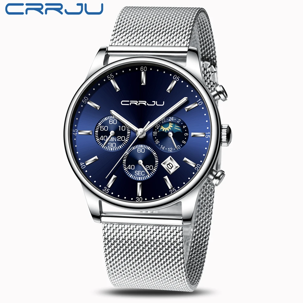 Часы наручные CRRJU Мужские кварцевые деловые, роскошные брендовые стильные водонепроницаемые спортивные повседневные с серебристым ремешком и синим циферблатом, 2021