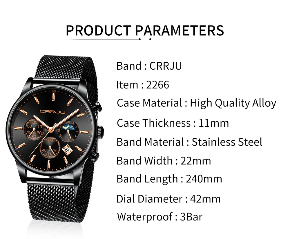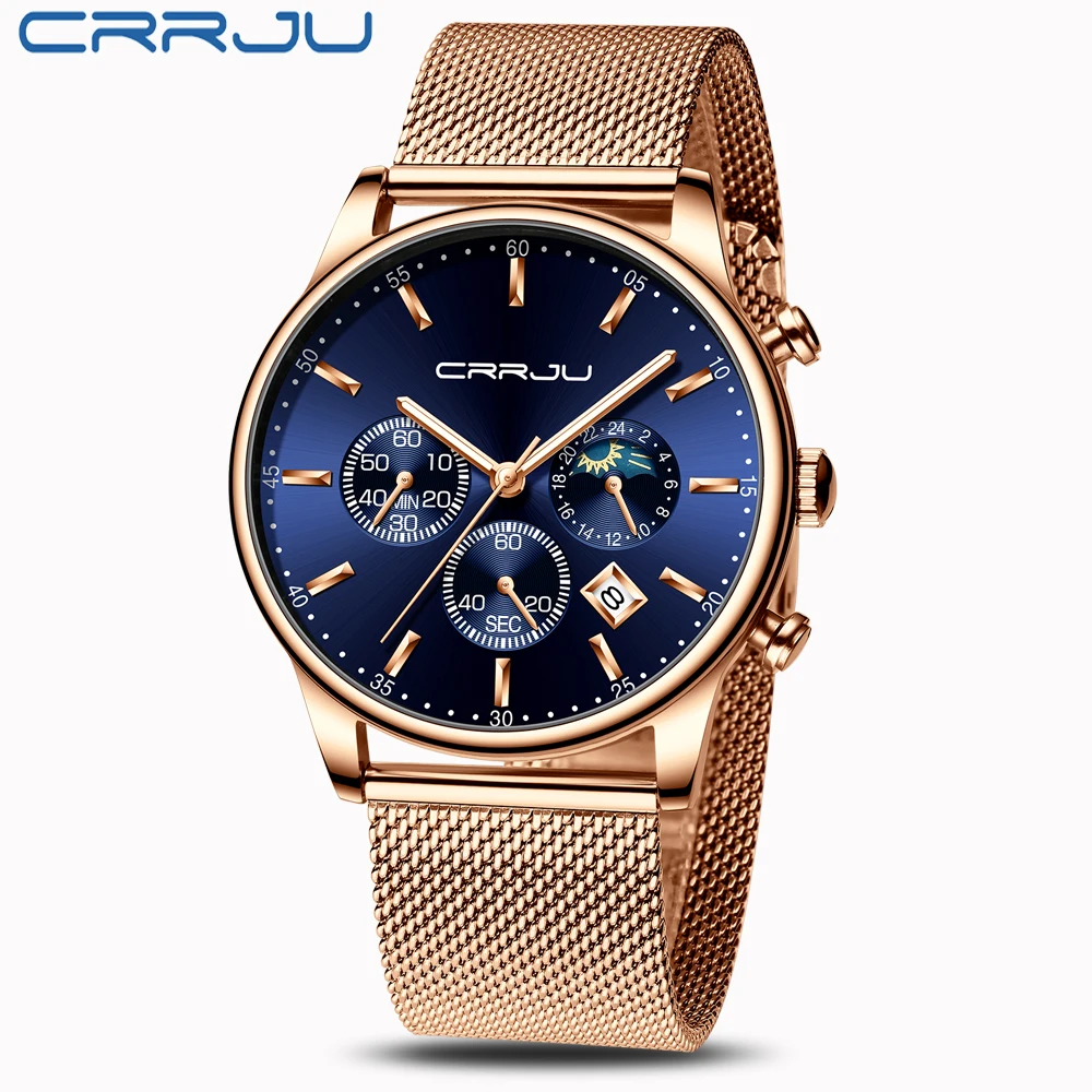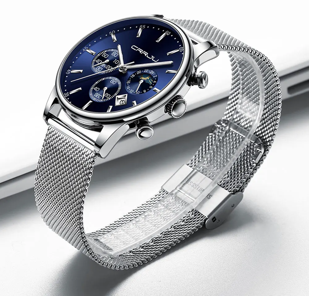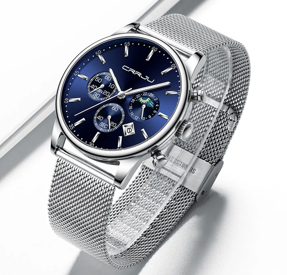 Часы наручные CRRJU Мужские кварцевые деловые, роскошные брендовые стильные водонепроницаемые спортивные повседневные с серебристым ремешком и синим циферблатом, 2021