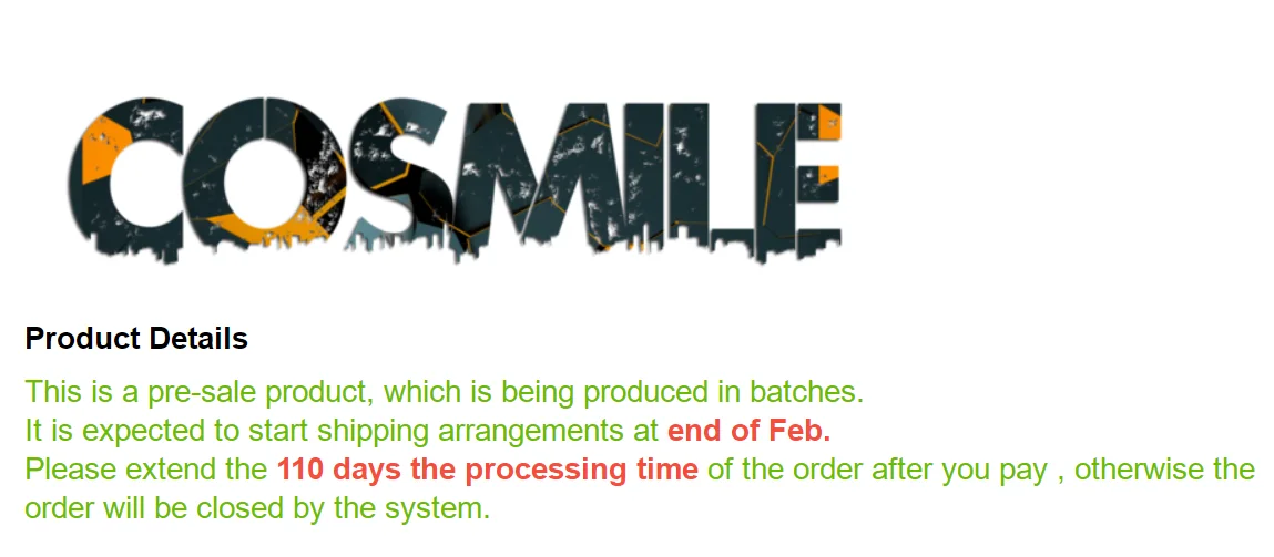 Пожалуйста, Расширьте110 дней время обработкиПосле оплаты заказа, в противном случае заказ будет закрыт системой.