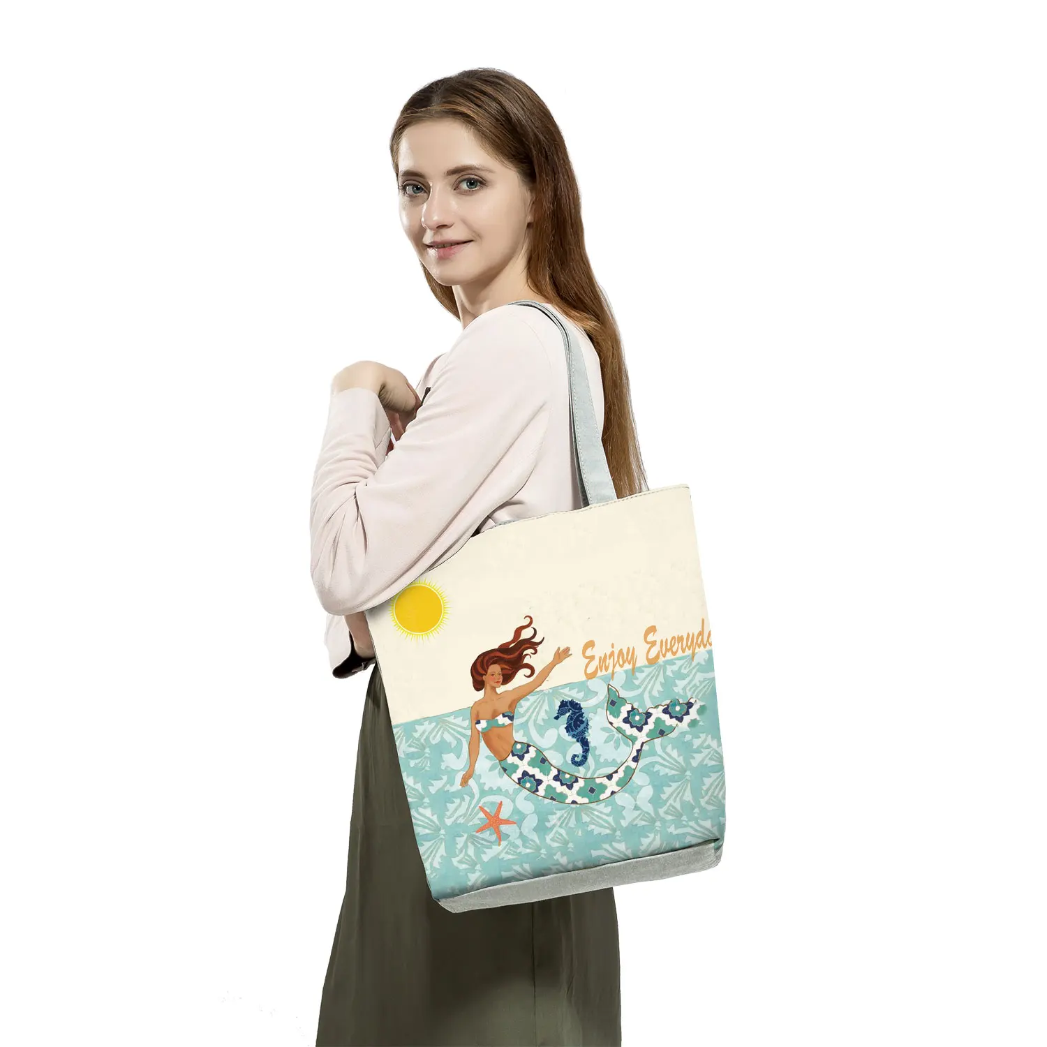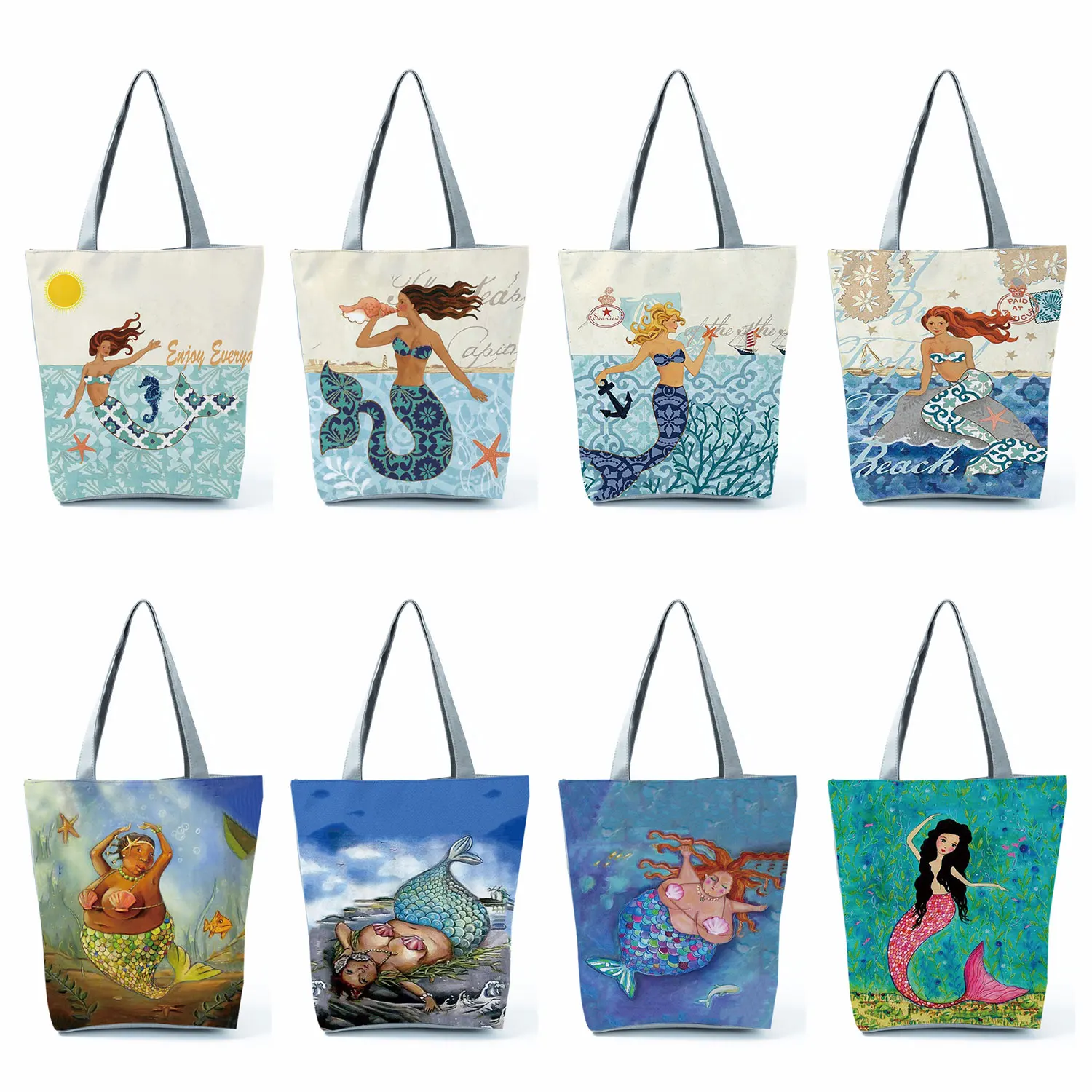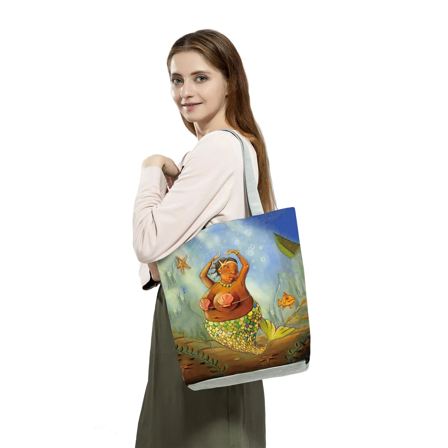 Дамские сумочки с принтом русалки, портативная тканевая сумка, вместительная Повседневная дорожная пляжная сумка для покупок, повседневный тоут с индивидуальным рисунком