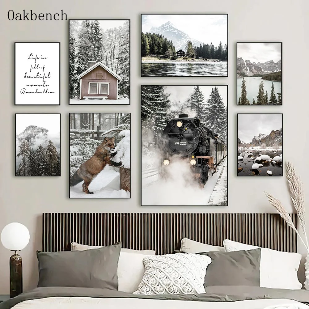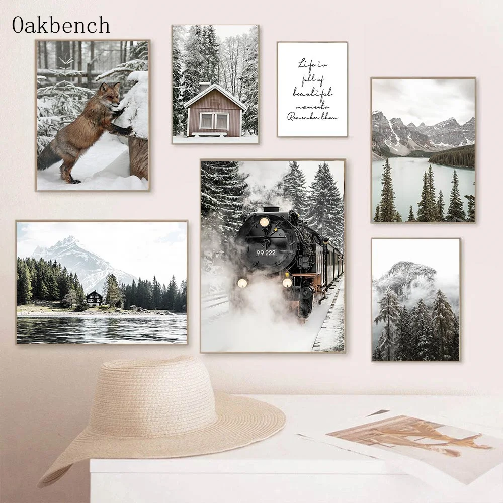 Настенный постер зимний Снежный лес лиса поезд деревянный дом художественный постер горный озеро пейзаж домашний декор холст постер Художественная печать настенные картины