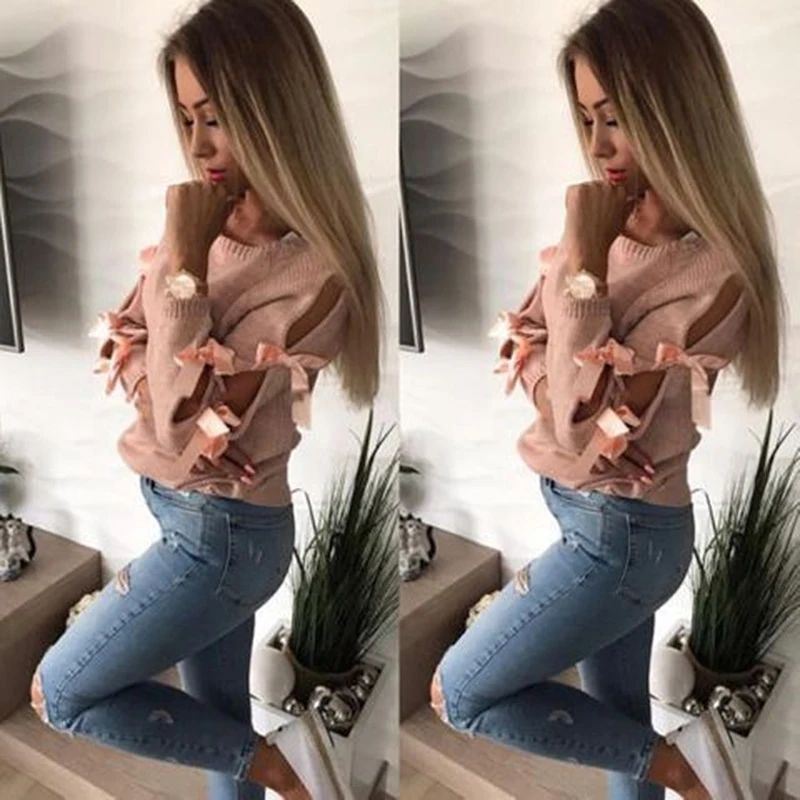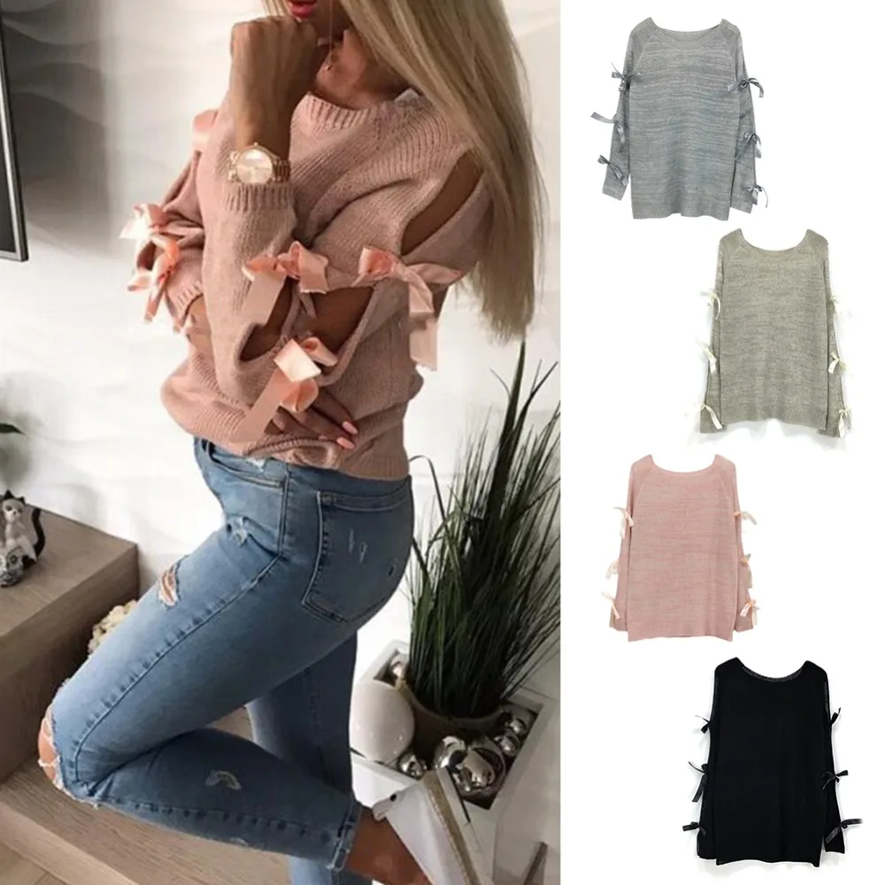 Женский вязаный пуловер с бантом, повседневный Свободный теплый сви...