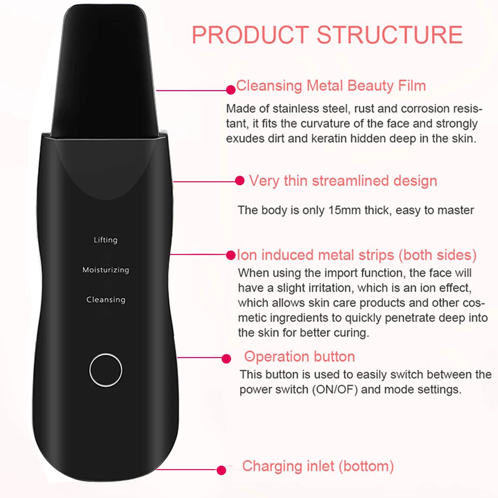 Функции: удаление черных точек, Чистка кожи, уменьшение морщин, отбеливание кожи, введение эссенцииЕмкость аккумулятора: 600 мАчАккумулятор: перезаряжаемый литий-полимерный аккумуляторРегулировка зубчатой передачи: можно регулировать три зубчатой передачиНапряжение: 3,7 VВыходная мощность: 2 ВтРежим зарядки: зарядка через USB (включая зарядный кабель)Выходное напряжение: 5 В/600 мАВремя зарядки: 3-4 ч