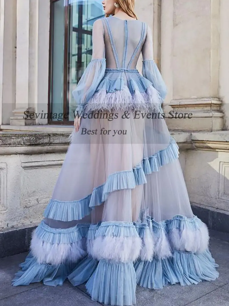 Платье женское вечернее ТРАПЕЦИЕВИДНОЕ с длинными рукавами и перьями